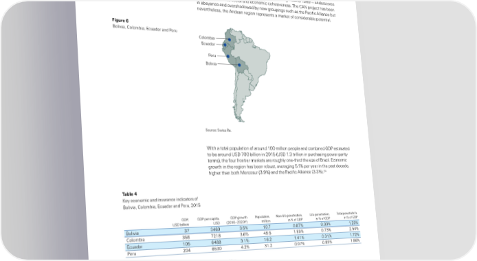 ›atin ‘merica: ‰oivia… Œoom ia… Ecuador and ƒeru ‰oivia… Œoom ia… Ecuador and ƒeru form ˆhe ‘ndean countries of ‰oivia… Œoom ia… Ecuador and ƒeru form ›atin ‘merica’s a cohesive frontier market ock‡ arest ock of frontier markets the other ein the much smaer rouin of Œentra ‘merican markets„‡ ˆheir mem ershi in the ‘ndean Œommunity of Nations Œomunidad ‘ndina… Œ‘N„ — a customs union datin ack to 1’6’ — underscores their eorahica… socia and economic cohesiveness‡ ˆhe Œ‘N ro“ect has een in a eyance and overshadowed y new rouins such as the ƒacific ‘iance ut nevertheess… the ‘ndean reion reresents a market of considera e otentia‡ Figure † ‰oivia… Œoom ia… Ecuador and ƒeru Colombia Ecuador Peru Bolivia Žource: Žwiss ‹e‡ ¦ith a tota ouation of around 100 miion eoe and com ined €‚ƒ estimated to e around ¥Ž‚ ¢00 iion in 201™ ¥Ž‚ 1‡¡ triion in urchasin ower arity terms„… the four frontier markets are rouhy one†third the siŠe of ‰raŠi‡ Economic rowth in the reion has een ro ust… averain ™‡1 er year in the ast decade… hiher than oth ˜ercosur ¡‡’„ and the ƒacific ‘iance ¡‡¡„‡24 Table ±ey economic and insurance indicators of ‰oivia… Œoom ia… Ecuador and ƒeru… 201™ €‚ƒ… €‚ƒ er caita… €‚ƒ rowth ƒouation… Non†ife enetration… ›ife enetration… ˆota enetration… ¥Ž‚ iion ¥Ž‚ 2016–2020—„ miion in of €‚ƒ in of €‚ƒ in of €‚ƒ ‰oivia ¡¢ ¡46’ ¡‡™ 10‡¢ 0‡¢ 0‡¡¡ 1‡20 Œoom ia ¡™ ¢21 ¡‡6 4’‡™ 1‡0 0‡¢¡ 2‡™4 Ecuador 10™ 64 ¡‡1 16‡2 1‡41 0‡¡1 1‡¢2 ƒeru 204 6™¡0 4‡2 ¡1‡2 0‡’¢ 0‡’ 1‡6 Žource: ”xford Economics… Žwiss ‹e Economic ‹esearch Ÿ Œonsutin‡ 24 ˜ercosur comrises ‘rentina… ‰raŠi… ƒarauay… ¥ruuay… and ªeneŠuea‡ ˆhe ƒacific ‘iance comrises Œhie… Œoom ia… ˜exico… and ƒeru‡ Swiss Re sigma No 2/2016 1™
