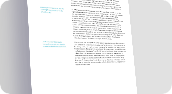 Entry stratey Entry stratey wi hine on the unišue —rontier markets can enefit from increased articiation of internationa insurers… characteristics of each market‡ oth in terms of underwritin caacity and technica exertise‡ ‘ critica šuestion when considerin enterin a new market is the feasi iity of oin in aone… in artnershi with a oca carrier or acšuirin an existin oca firm‡ ˆhe choice is continent on oca reuatory reimes… in articuar with reards to forein ownershi‡ ˜any emerin and frontier markets sti have restrictions on forein entrants throuh rešuirements on maximum forein sharehodins or “oint venture rešuirements‡ Even some esta ished emerin markets retain certain restrictions‡ ‘cšuirin a oca ayer can he the ‘ entry routes have advantaes and associated risks‡ Žome insurers are rowin incomin forein insurer to “hit the oranicay as we as throuh acšuisition in frontier markets… as ‘ianŠ… for exame… round runnin”‡ has done to increase its resence in ‘sia… the ŒEE and ›atin ‘merica‡ ”ther exames are ‘»‘’s recent acšuisition of ™1 stake in Œoatria’s insurance ¡¡ oeration in Œoum ia and ƒrudentia’s acšuisition of ¥andan comany €odstar ›ife ‘ssurance‡¡4 ‘cšuisition of existin insurers rovides forein insurers an aready† esta ished atform in the oca market… which aows them to “hit the round runnin”‡ £owever… a startin chaene is that the insurance sectors in emerin markets tend to e reativey concentrated… and the est erformin insurers are ess ikey to e u for sae‡ ‘ more reaistic aroach is to acšuire a medium†siŠe second tier ayer with otentia for imrovement‡ ‰ut then interatin the new comany into the insurer’s o a oerations resents further chaenes… such as deain with eacy ortfoios and roer vauations of oca assets… articuary in view of the innate voatiity of smaer markets‡ §oint ventures and distri ution §oint ventures with oca artners or tie†us with distri ution networks can aso e artnershis are often emoyed to used to esta ish a resence in emerin and frontier markets‡ ˆhis otion rovides ta existin distri ution caa iities‡ the forein entity a stron oca rand name… market exertise… oca skis to tacke ocation†secific o staces more smoothy… and wide consumer reach‡ ‘»‘’s move ¡™ into Indonesia and ˜aaysia … and ¹urich Žantander’s ife distri ution arranement ¡6 in ›atin ‘merica are exames of o a insurers everain oca artners to esta ish themseves in new markets‡ £owever… in this mode the forein artner sti faces interation chaenes inked to cutura differences and ease of doin usiness‡ ‘t the same time… the strateic interest of the oca artner can divere from that of the forein artner… creatin deay in decision makin and otentiay erosion of rand vaue‡ 33 Ž to c‘uire „ƒ’ o Œolpatria’s Insurance Operations and Enter the Œolombian arket, 11 Novem er 201¡… ‘»‘… htt://www‡axa‡com/i /en/i rary/r/rou/201¡/144¢‡asx 34 Prudential plc ac‘uires Goldstar ”ie ssurance in •ganda… 2¡ §une 201™… ƒrudentia… htt://www‡rudentia‡u/media/ress†reease/201™†06†2¡/¡26/ 35 Ž and bank andiri in –oint —enture to develop General Insurance ˜usiness… ‘»‘… ‘ri 2011… htt://www‡axa†ins‡com‡cn/™2¢/en/±now†us†‰etter/‘»‘†News/‘»‘†and†‰ank†˜andiri†in†§oint† ªenture†to†deveo†€enera†Insurance†‰usiness 36 ™urich and antander announce longterm alliance in ”atin merica… 22 —e ruary 2011… ¹urich —inancia Žervices €rou… htts://www‡Šurich‡com/en/media/news†reeases/2011/2011†0222†01 Swiss Re sigma No 2/2016 2™
