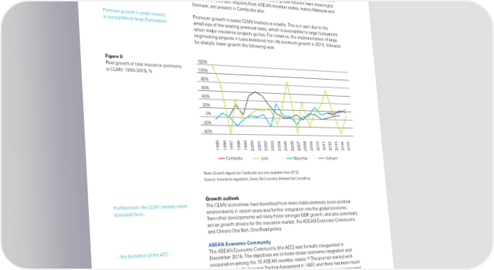 Insurance in the frontier markets … whie markets are em arkin on ˆhese markets are revisin insurance and reated reuations to ena e faster sector i eraisation and de†reuation‡ rowth‡ —or exame… a new Insurance ›aw in Œam odia took effect from —e ruary 201™‡ In ˜yanmar… where the insurance market has een in state hands since 1’6¡… in 201¡ tweve rivate comanies were ranted conditiona arova to rovide insurance services‡2¢ ¦hie a Œ›˜ª markets aow forein articiation… there is ack of carity over esta ishment rues‡ ˆo date… o a insurers have meaninfu resence in ªietnam‡ Insurers from ‘ŽE‘N mem er states… mainy ˜aaysia and ªietnam… are resent in Œam odia aso‡ ƒremium rowth in sma markets ƒremium rowth in some Œ›˜ª markets is voatie‡ ˆhis is in art due to the is susceti e to are fuctuations‡ sma siŠe of the existin remium ase… which is susceti e to are fuctuations when ma“or insurance ro“ects o ive‡ —or instance… the imementation of are enineerin ro“ects in ›aos ostered non†ife remium rowth in 2012… foowed y shary ower rowth the foowin year‡ Figure Œ 120% ‹ea rowth of tota insurance remiums 100% in Œ›˜ª… 1’’™†201™… 80% 60% 40% 20% 0% –20% –40% 95 96 97 98 99 00 01 02 03 04 05 06 07 08 09 10 11 12 13 14 15 19 19 19 19 19 20 20 20 20 20 20 20 20 20 20 20 20 20 20 20 20 Cambodia Laos Myanmar Vietnam Note: €rowth fiures for Œam odia are ony avaia e from 2012‡ Žource: Insurance reuators… Žwiss ‹e Economic ‹esearch Ÿ Œonsutin‡ rowth outlook —urthermore… the Œ›˜ª markets stand ˆhe Œ›˜ª economies have enefited from more sta e domestic socio†oitica to enefit from ‡‡‡ environments in recent years and further interation into the o a economy‡ ˆwo other deveoments wi ikey foster stroner €‚ƒ rowth… and aso otentiay act as rowth drivers for the insurance market… the ‘ŽE‘N Economic Œommunity and Œhina’s ”ne ‰et… ”ne ‹oad oicy‡ ASAŠ conomic ommunit‹ … the formation of the ‘EŒ … ˆhe ‘ŽE‘N Economic Œommunity the ‘EŒ„ was formay inauurated in ‚ecem er 201™‡ ˆhe o “ectives are to foster coser economic interation and cooeration amon the 10 ‘ŽE‘N mem er states‡2 ˆhe “ourney started with the sinin of a ƒreferentia ˆradin ‘reement in 1’’¢… and there has een much roress since‡ —or exame… roduct and safety standards have een harmoniŠed… investment areements imemented… and iots introduced to faciitate customs transit‡ 27 “˜yanmar – ‘sia’s ast frontier economy?” sia Insurance Revie, ˜arch 201¡‡ 28 ˆhe 10 ‘ŽE‘N mem ers incude ‰runei ‚arussaam… Œam odia… Indonesia… ›ao ƒ‚‹ ›aos„… ˜aaysia… ˜yanmar… ƒhiiines… Žinaore… ˆhaiand and ªietnam‡ 20 Swiss Re sigma No 2/2016