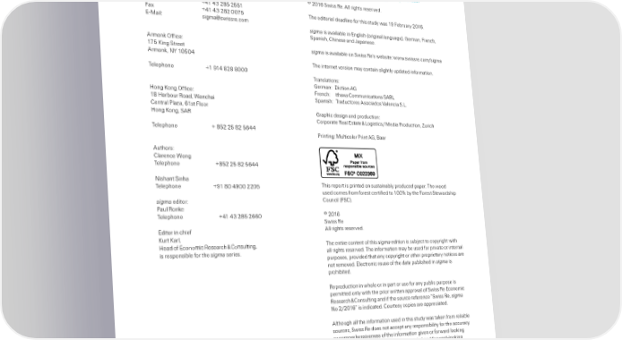 ƒu ished y: Žwiss ‹e ›td Economic ‹esearch Ÿ Œonsutin ƒ‡”‡ ‰ox Exore and visuaiŠe sigma data on natura catastrohes and 022 ¹urich the word insurance markets at www‡sigma†exorer‡com ŽwitŠerand © 2016 Žwiss ‹e‡ ‘ rihts reserved‡ ˆeehone Á41 4¡ 2™ 2™™1 —ax Á41 4¡ 22 00¢™ ˆhe editoria deadine for this study was 1’ —e ruary 2016‡ E†˜ai: simaÂswissre‡com sigma is avaia e in Enish oriina anuae„… €erman… —rench… Žanish… Œhinese and §aanese‡ ‘rmonk ”ffice: 1¢™ ±in Žtreet sigma is avaia e on Žwiss ‹e’s we site: www‡swissre‡com/sima ‘rmonk… N¼ 10™04 ˆhe internet version may contain sihty udated information‡ ˆeehone Á1 ’14 2 000 ˆransations: €erman: ‚iction ‘€ £on ±on ”ffice: —rench: ithaxa Œommunications Ž‘‹› 1 £ar our ‹oad… ¦anchai Žanish: ˆraductores ‘sociados ªaencia އ›‡ Œentra ƒaŠa… 61st —oor £on ±on… Ž‘‹ €rahic desin and roduction: Œororate ‹ea Estate Ÿ ›oistics / ˜edia ƒroduction… ¹urich ˆeehone Á ™2 2™ 2 ™644 ƒrintin: ˜uticoor ƒrint ‘€… ‰aar ‘uthors: Œarence ¦on ˆeehone Á™2 2™ 2 ™644 Nishant Žinha ˆeehone Á’1 0 4’00 220™ ˆhis reort is rinted on sustaina y roduced aer‡ ˆhe wood used comes from forest certified to 100 y the —orest Žtewardshi sigma editor: Œounci —ŽŒ„‡ ƒau ‹onke ˆeehone Á41 4¡ 2™ 2660 © 2016 Žwiss ‹e Editor in chief ‘ rihts reserved‡ ±urt ±ar… £ead of Economic ‹esearch Ÿ Œonsutin… ˆhe entire content of this sigma edition is su “ect to coyriht with is resonsi e for the sigma series‡ a rihts reserved‡ ˆhe information may e used for rivate or interna uroses… rovided that any coyriht or other rorietary notices are not removed‡ Eectronic reuse of the data u ished in sigma is rohi ited‡ ‹eroduction in whoe or in art or use for any u ic urose is ermitted ony with the rior written arova of Žwiss ‹e Economic ‹esearch Ÿ Œonsutin and if the source reference “Žwiss ‹e… sigma No 2/2016” is indicated‡ Œourtesy coies are areciated‡ ‘thouh a the information used in this study was taken from reia e sources… Žwiss ‹e does not accet any resonsi iity for the accuracy ˆhe authors woud ike to thank —inn ±rüer… or comrehensiveness of the information iven or forward ookin ‘rend ±uenkamff and ‚anie Žtai for statements made‡ ˆhe information rovided and forward†ookin their contri utions on the anaysis of the statements made are for informationa uroses ony and in no Œommonweath of Indeendent Žtates… way constitute or shoud e taken to refect Žwiss ‹e’s osition… ›atin ‘merica and Žu †Žaharan ‘frica in articuar in reation to any onoin or future disute‡ In no event reions… resectivey‡ ˆhanks aso to ¹erina sha Žwiss ‹e e ia e for any oss or damae arisin in connection ¹en for her work on market data anaysis‡ with the use of this information and readers are cautioned not to ace undue reiance on forward†ookin statements‡ Žwiss ‹e undertakes no o iation to u icy revise or udate any forward†ookin statements… whether as a resut of new information… future events or otherwise‡ ”rder no: 2¢0½0216½en
