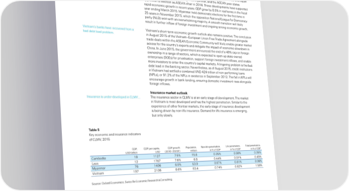 ˜yanmar has em arked on a series Žince takin office in 2011… the current overnment in ˜yanmar has em arked on of economic and oitica reforms‡ a series of economic and ro†democracy oitica reforms‡ ±ey measures incude adotin a manaed foat exchane rate reime… removin forein exchane restrictions… easin constraints on forein investment… increasin overnment sendin on heath and education… and imrovin eisation‡ ˆhe ¥Ž… E¥ and §aan have a oished most sanctions aainst ˜yanmar… and the ‘ŽE‘N eer states aroved its eection as ‘ŽE‘N chair in 2014‡ ˆhese deveoments have suorted raid economic rowth in recent years: €‚ƒ rew y ‡™ in rea terms in the fisca year endin ˜arch 201™‡ ˜yanmar hed democratic eections for the first time in 2™ years in Novem er 201™… which the oosition Nationa ›eaue for ‚emocracy arty N›‚„ won with an overwhemin ma“ority‡ ‘ smooth transition wi ikey resut in further infow of forein investment and onoin stron economic rowth‡ ªietnam’s anks have recovered from a ªietnam’s short†term economic rowth outook aso remains ositive‡ ˆhe concusion ad de t oad ro em‡ in ‘uust 201™ of the ªietnam–Euroean ¥nion —ree ˆrade ‘reement aonside trade deas within the ‘ŽE‘N Economic Œommunity wi ikey ena e reater market access for the country’s exorts and mitiate the imact of economic sowdown in Œhina‡ In §une 201™… the overnment announced the end of a 4’ ca on forein ownershi in a rane of sectors… which is exected to oen u state†owned enterrises Ž”Es„ for rivatisation… suort forein investment infows… and ena e more investors to enter the country’s caita markets‡ ‘ inerin ro em is the ad de t oad in the ankin sector‡ Nevertheess… as of ‘uust 201™… credit institutions in ªietnam had setted a com ined ªN‚ 424 triion of non†erformin oans Nƒ›s„… or ’1‡2 of the Nƒ›s in existence in Žetem er 2012‡ ˆhe fa in Nƒ›s wi encourae rowth in ank endin… ensurin domestic investment rises aonside forein infows‡ Insurance market outlook Insurance is under†deveoed in Œ›˜ª … ˆhe insurance sector in Œ›˜ª is at an eary stae of deveoment‡ ˆhe market in ªietnam is most deveoed and has the hihest enetration‡ Žimiar to the exerience of other frontier markets… the eary stae of insurance deveoment is ein driven y non†ife insurance‡ ‚emand for ife insurance is emerin… ut ony sowy‡ Table … ±ey economic and insurance indicators of Œ›˜ª… 201™ €‚ƒ… €‚ƒ er caita… €‚ƒ rowth ƒouation… Non†ife enetration… ›ife enetration… ˆota enetration… ¥Ž‚ iion ¥Ž‚ 2016–2020—„ miion in of €‚ƒ in of €‚ƒ in of €‚ƒ Œam odia 1 112¢ ¢‡™ 1™‡6 0‡¡™ 0‡00 0‡¡™ ›aos 12 1¢6¢ ¢‡6 6‡ 0‡44 0‡01 0‡4™ ˜yanmar ¢6 1406 6‡’ ™¡‡’ 0‡0¢ 0‡01 0‡0 ªietnam 1’¢ 2106 6‡6 ’¡‡4 0‡¢4 0‡2 1‡™6 Žource: ”xford Economics… Žwiss ‹e Economic ‹esearch Ÿ Œonsutin‡ Swiss Re sigma No 2/2016 1’