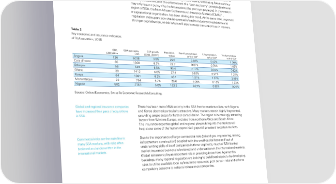 Insurance in the frontier markets ±enya is the most advanced amon ”f the frontier markets… ±enya has the most sohisticated insurance sector and the ŽŽ‘ frontier markets… ut there reuatory framework… and aso the hihest eve of insurance enetration‡ In the are initiatives to increase insurance other countries… awareness of the imortance of insurance for economic and socia enetration esewhere in the reion‡ roress is rowin… and overnments and reuators are increasin their efforts to foster rowth of an effective insurance industry‡ ”ne area of activity is eimination of maractices… such as non†ayment of eitimate caims… eiminatin fake insurance oicies/comanies… and the enforcement of a “cash and carry” rincie an insurer may ony issue a oicy after he has received the remium ayment„‡ In the western 14 reion of ŽŽ‘… the Inter†‘frican Œonference on Insurance ˜arkets ŒI˜‘„ … a suranationa oranisation… has een drivin this trend‡ ‘t the same time… imroved reuation and suervision shoud eventuay ead to industry consoidation and stroner caitaisation… which in turn wi aso increase consumer trust in insurers‡ Table 2 ±ey economic and insurance indicators of ŽŽ‘ countries… 201™ €‚ƒ… €‚ƒ er caita… €‚ƒ rowth ƒouation… Non†ife enetration… ›ife enetration… ˆota enetration… ¥Ž‚ iion ¥Ž‚ 2016–2020—„ miion in of €‚ƒ in of €‚ƒ in of €‚ƒ ‘noa 126 ™0¡ ¡‡’ 2™‡0 0‡’ 0‡02 1‡00 Œote d’Ivoire ¡0 1¡0 6‡¢ 22‡¢ 0‡¢ 0‡¢™ 1‡62 Ethioia ™ ™¡ 6‡™ ’’‡4 0‡™¢ 0‡04 0‡62 €hana ¡’ 1412 6‡0 2¢‡4 0‡™¢ 0‡™1 1‡0¢ ±enya 64 1¡1 6‡2 46‡1 1‡’1 1‡0¢ 2‡’ ˜oŠam išue 22 ¢’4 6‡¢ 2‡0 1‡0™ 0‡1 1‡2¡ Nieria ™02 2¢™¡ ™‡0 12‡2 0‡21 0‡0 0‡2’ Žource: ”xford Economics… Žwiss ‹e Economic ‹esearch Ÿ Œonsutin‡ €o a and reiona insurance comanies ˆhere has een more ˜Ÿ‘ activity in the ŽŽ‘ frontier markets of ate… with Nieria have increased their ace of acšuisitions and ±enya deemed articuary attractive‡ ˜any markets remain hihy framented… in ŽŽ‘‡ rovidin ame scoe for further consoidation‡ ˆhe reion is increasiny attractin uyers from ¦estern Euroe… and aso from northern ‘frica and Žouth ‘frica‡ ˆhe insurance exertise o a and reiona ayers rin into the markets wi he cose some of the human caita ski as sti revaent in certain markets‡ Œommercia risks are the main ine in ‚ue to the imortance of are commercia risks oi and as… enineerin… minin… many ŽŽ‘ markets… with risks often infrastructure construction„ coued with the sma caita ase and ack of rokered and underwritten in the underwritin skis of oca comanies in these sements… much of ŽŽ‘ frontier internationa markets‡ market insurance usiness is rokered and underwritten in the internationa markets‡ €o a reinsurers ay an imortant roe in rovidin know†how‡ ‘ainst this ackdro… many reiona reuators are ookin to uid oca caacity y deveoin rues to utiise avaia e oca re/insurance resources… oo certain risks and enforce comusory cessions to nationa reinsurance comanies‡ 14 ˜em ers: ‰enin… ‰urkina —aso… Œameroon… Œentra ‘frican ‹eu ic… Œomoros… Œono… Œôte d’Ivoire… €a on… Ešuatoria €uinea… €uinea ‰issau since 2002… first non†francohone mem er„… ˜ai… Nier… Ženea… Œhad and ˆoo‡ ŒI˜‘ has reuatory and suervisory authority in the mem er states to reare for a common insurance market‡ Swiss Re sigma No 2/2016
