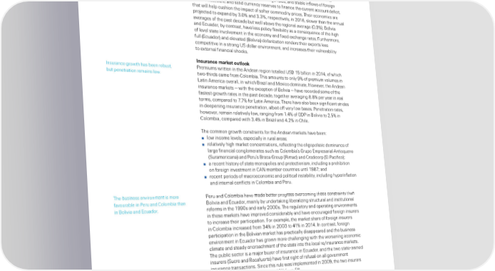 Insurance in the frontier markets conomic deeloment ˆhe ma“or ‘ndean economies are ˆhe near†term economic outook is mixed… refectin the ‘ndean countries’ diverse outacin their reiona eers‡ economic oicy frameworks… oitica cimates and macroeconomic fundamentas‡ ‘ four countries rey heaviy on commodity exorts and are exosed to the current o a commodity rice down†cyce‡ £owever… Œoom ia and ƒeru have sound oicy frameworks in ace… fexi e exchane rates… and sta e infows of forein direct investment and soid currency reserves to finance the current account deficit… that wi he cushion the imact of softer commodity rices‡ ˆheir economies are ro“ected to exand y ¡‡0 and ¡‡¡… resectivey… in 2016… sower than the annua averaes of the ast decade ut we a ove the reiona averae 0‡’„‡ ‰oivia and Ecuador… y contrast… have ess oicy fexi iity as a consešuence of the hih of eve state invovement in the economy and fixed exchane rates‡ —urthermore… fu Ecuador„ and eevated ‰oivia„ doariŠation renders their exorts ess cometitive in a stron ¥Ž doar environment… and increases their vunera iity to externa financia shocks‡ Insurance market outlook Insurance rowth has een ro ust… ƒremiums written in the ‘ndean reion totaed ¥Ž‚ 1™ iion in 2014… of which ut enetration remains ow‡ two†thirds came from Œoom ia‡ ˆhis amounts to ony ’ of remium voumes in ›atin ‘merica overa… in which ‰raŠi and ˜exico dominate‡ £owever… the ‘ndean insurance markets — with the excetion of ‰oivia — have recorded some of the fastest rowth rates in the ast decade… toether averain ‡ er year in rea terms… comared to ¢‡¢ for ›atin ‘merica‡ ˆhere have aso een sinificant strides in deeenin insurance enetration… a eit off very ow ases‡ ƒenetration rates… however… remain reativey ow… ranin from 1‡4 of €‚ƒ in ‰oivia to 2‡™ in Œoom ia… comared with ¡‡4 in ‰raŠi and 4‡2 in Œhie‡ ˆhe common rowth constraints for the ‘ndean markets have een: ̤ ow income eves… eseciay in rura areas° ̤ reativey hih market concentrations… refectin the oiooistic dominance of are financia conomerates such as Œoom ia’s €ruo Emresaria ‘ntiošueno Žuramericana„ and ƒeru’s ‰reca €rou ‹imac„ and Œredicor E ƒacifico„° ̤ a recent history of state monooies and rotectionism… incudin a rohi ition on forein investment in Œ‘N mem er countries unti 1’¢° and ̤ recent eriods of macroeconomic and oitica insta iity… incudin hyerinfation and interna conficts in Œoom ia and ƒeru‡ ˆhe usiness environment is more ƒeru and Œoom ia have made etter roress overcomin these constraints than favoura e in ƒeru and Œoom ia than ‰oivia and Ecuador… mainy y undertakin i eraiŠin structura and institutiona in ‰oivia and Ecuador‡ reforms in the 1’’0s and eary 2000s‡ ˆhe reuatory and oeratin environments in these markets have imroved considera y and have encouraed forein insurers to increase their articiation‡ —or exame… the market share of forein insurers in Œoom ia increased from ¡4 in 200¡ to 41 in 2014‡ In contrast… forein articiation in the ‰oivian market has racticay disaeared and the usiness environment in Ecuador has rown more chaenin with the worsenin economic cimate and steady encroachment of the state into the oca re/insurance markets‡ ˆhe u ic sector is a ma“or uyer of insurance in Ecuador… and the two state†owned insurers Žucre and ‹ocafuerte„ have first riht of refusa on a overnment insurance transactions‡ Žince this rue was imemented in 200’… the two insurers have rown their market share to 16 from ™‡ 16 Swiss Re sigma No 2/2016