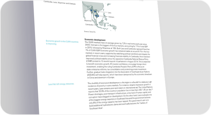 Insurance in the frontier markets Žoutheast ‘sia frontier insurance markets: Œam odia… ›aos… ˜yanmar and ªietnam ˆhe Œ˜›ª countries are Œam odia… ›aos… Œ›˜ª refers to Œam odia… ›aos… ˜yanmar and ªietnam‡ ˆhey are four of the smaer ˜yanmar and ªietnam‡ markets in Žoutheast ‘sia and have seen sinificant deveoment in recent years‡ Figure ‰ Œam odia… ›aos… ˜yanmar and ªietnam Laos Vietnam Myanmar Cambodia Žource: Žwiss ‹e‡ conomic deeloment Economic rowth in the Œ›˜ª countries ˆhe Œ›˜ª markets have on averae rown y ¢‡2 in rea terms each year since is imrovin‡ 2000‡ ªietnam is the iest of the four markets… accountin for ¢1 of tota €‚ƒ in 201™… foowed y ˜yanmar at 1‡ ‰oth ›aos and Œam odia reresent ess than ¢ of Œ›˜ª €‚ƒ‡ Economic rowth has remained sta e at around 6†¢ in the four markets in recent years… suorted y sta iisin oitica conditions and desite the o a financia crisis and increasin financia voatiity‡ In Œam odia… there has een imroved oitica sta iity since the oosition Œam odia Nationa ‹escue ƒarty ŒN‹ƒ„ ended its 10†month oycott of ariament in ‘uust 2014‡ ˆhis is exected to enefit economic rowth… ift investor confidence… encourae forein direct investment… ena in the ruin Œam odia ƒeoe’s ƒarty Œƒƒ„ to focus on state enterrise reforms… tax consoidation and romotin rivate investment‡ —urther… radua trade interation into the ‘ssociation of Žoutheast ‘sian Nations ‘ŽE‘N„ wi he exorts… which have een damened y the economic sowdown in Œhina and downturn in Euroe‡ ›aos has rich enery resources‡ ˆhe diversity of economic deveoment in the reion is refected in a reativey hih incidence of overty in some markets‡ —or instance… desite imressive rowth in recent years… ›aos remains oor and reiant on internationa aid‡ ˆhe ¥nited Nations reorts that ¡¡‡’ of the country’s ouation ive on ess than ¥Ž‚ 1‡2™ er day‡26 ƒower shortaes… oor transort infrastructure… a ow eve of human caita… and corrution have draed on deveoment‡ ”n the other hand… ›aos is aready one of the iest enery exorters in Žoutheast ‘sia and the overnment eieves ony of the enery caacity has een taed‡ ˆhe overnment’s aim is to uid additiona hydroeectric dams and eventuay ecome the “ attery of Žoutheast ‘sia”‡ 26 illennium Development Goals Database… ¥N Žtatistics ‚ivision… 201™ htt://mds‡un‡or/unsd/md/ ‚ata‡asx 1 Swiss Re sigma No 2/2016