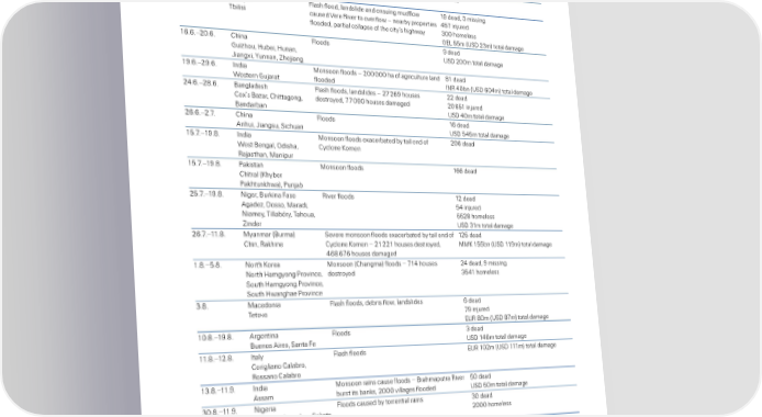 Number o ictimsœamount o damage ate CountrŒ …ent šhere ‚ata available›… local currency an‚/or Ž‘’ ˆ6ˆ–5ˆ6ˆ –hana ˜lash floo‚s 25 ‚ea‚ Accra 5000 homeless ÂŽ‘’ 12m total ‚amae 10ˆ6ˆ Nepal ˜loo‚s trier lan‚sli‚e 6 ‚ea‚ aple un ’istrict 1ˆ6ˆ–1„ˆ6ˆ –eoria ˜lash floo‚… lan‚sli‚e an‚ ensuin mu‚flo 1† ‚ea‚… missin bilisi cause‚ ´ere iver to overflo – nearby properties „5 in ure‚ floo‚e‚… partial collapse of the city’s hihay 00 homeless –Eƒ 55m šŽ‘’ 2m› total ‚amae 16ˆ6ˆ–20ˆ6ˆ China ˜loo‚s † ‚ea‚ –uihou… žubei… žunan… Ž‘’ 200m total ‚amae ¤ianxi… µunnan… «he ian 1†ˆ6ˆ–2†ˆ6ˆ “n‚ia Šonsoon floo‚s – 200 000 ha of ariculture lan‚ ‡1 ‚ea‚ ¨estern –u arat floo‚e‚ “N „0bn šŽ‘’ 60„m› total ‚amae 2„ˆ6ˆ–2‡ˆ6ˆ ”anla‚esh ˜lash floo‚s… lan‚sli‚es – 2 26† houses 22 ‚ea‚ Cox’s ”aar… Chittaon… ‚estroye‚… 0†0 houses ‚amae‚ 20 651 in ure‚ ”an‚arban Ž‘’ „0m total ‚amae 26ˆ6ˆ–2ˆˆ China ˜loo‚s 16 ‚ea‚ Anhui… ¤iansu… ‘ichuan Ž‘’ 5„5m total ‚amae 15ˆˆ–1†ˆ‡ˆ “n‚ia Šonsoon floo‚s exacerbate‚ by tail en‚ of 206 ‚ea‚ ¨est ”enal… ™‚isha… Cyclone Ÿomen a asthan… Šanipur 15ˆˆ–1†ˆ‡ˆ •a€istan Šonsoon floo‚s 166 ‚ea‚ Chitral šŸhyber •a€htun€ha›… •un ab 25ˆˆ–1†ˆ‡ˆ Nier… ”ur€ina ˜aso iver floo‚s 12 ‚ea‚ Aa‚e… ’osso… Šara‚i… 5„ in ure‚ Niamey… illabéry… ahoua… 552‡ homeless «in‚er Ž‘’ 1m total ‚amae 26ˆˆ–11ˆ‡ˆ Šyanmar š”urma› ‘evere monsoon floo‚s exacerbate‚ by tail en‚ of 125 ‚ea‚ Chin… a€hine Cyclone Ÿomen – 21 221 houses ‚estroye‚… ŠŠŸ 155bn šŽ‘’ 11†m› total ‚amae „6‡ 66 houses ‚amae‚ 1ˆ‡ˆ–5ˆ‡ˆ North Ÿorea Šonsoon šChanma› floo‚s – 1„ houses 2„ ‚ea‚… † missin North žamyon •rovince… ‚estroye‚ 5„1 homeless ‘outh žamyon •rovince… ‘outh žanhae •rovince ˆ‡ˆ Šace‚onia ˜lash floo‚s… ‚ebris flo… lan‚sli‚es 6 ‚ea‚ etovo † in ure‚ EŽ ‡0m šŽ‘’ ‡m› total ‚amae 10ˆ‡ˆ–1†ˆ‡ˆ Arentina ˜loo‚s ‚ea‚ ”uenos Aires… ‘anta ˜e Ž‘’ 1„6m total ‚amae 11ˆ‡ˆ–12ˆ‡ˆ “taly ˜lash floo‚s EŽ 102m šŽ‘’ 111m› total ‚amae Coriliano Calabro… ossano Calabro 1ˆ‡ˆ–11ˆ†ˆ “n‚ia Šonsoon rains cause floo‚s – ”rahmaputra iver 50 ‚ea‚ Assam burst its ban€s… 2000 villaes floo‚e‚ Ž‘’ 50m total ‚amae 0ˆ‡ˆ–11ˆ†ˆ Nieria ˜loo‚s cause‚ by torrential rains 0 ‚ea‚ «amfara… Anambra… ‘o€oto… 2000 homeless Ÿebbi… Ÿano †ˆ†ˆ–11ˆ†ˆ ¤apan ˜loo‚in an‚ „55 lan‚sli‚es ‚ue to tropical storm ‡ ‚ea‚ ¤oso š“bara€i›… ochii… Etau – Ÿinuaa iver burst its ban€s in the city of „6 in ure‚ Šiyai ¤oso… 16 houses ‚estroye‚… 102 houses seriously ¤•µ „0bn šŽ‘’ m› insure‚ loss ‚amae‚… 1‡ ‡‡2 houses floo‚e‚… more than Ž‘’ 500m total ‚amae 1000 people stran‚e‚ 1ˆ10ˆ–2ˆ10ˆ “n‚ia Šonsoon floo‚s – ‚amae to ariculture „† ‚ea‚ ‘outhern ami Na‚ul “N 1bn šŽ‘’ 15m› total ‚amae ˆ10ˆ–„ˆ10ˆ ˜rance orrential rains brin flash floo‚s 20 ‚ea‚ Alpes‰Šaritimes… ´ar… EŽ 600m šŽ‘’ 652m› insure‚ loss Côte ‚’Aur EŽ ‡50m šŽ‘’ †2„m› total ‚amae Swiss Re sigma No 1/2016 25