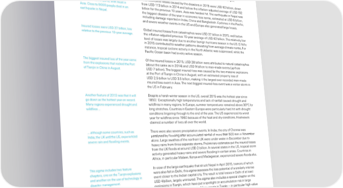 Executive summary “n 2015… there ere a recor‚ 1†‡ natural here ere 5 ‚isaster events in 2015… of hich 1†‡ ere natural catastrophes… catastrophesˆ the hihest ever recor‚e‚ in one yearˆ here ere 155 man‰ma‚e eventsˆ Šore than 26 000 people lost their lives or ent missin in the ‚isasters… ‚ouble the number of ‚eaths in 201„ but ell belo the yearly averae since 1††0 of 66 000ˆ he biest loss of life – close to †000 people – came in an earthŒua€e in Nepal in Aprilˆ –lobally… total losses from ‚isasters ere otal economic losses cause‚ by the ‚isasters in 2015 ere Ž‘’ †2 billion… ‚on Ž‘’ †2 billion in 2015… ith most in from Ž‘’ 11 billion in 201„ an‚ belo the inflation‰a‚ uste‚ averae of Ž‘’ 1†2 Asiaˆ Close to †000 people ‚ie‚ in an billion for the previous 10 yearsˆ Asia as har‚est hitˆ he earthŒua€e in Nepal as earthŒua€e in Nepalˆ the biest ‚isaster of the year in economic‰loss terms… estimate‚ at Ž‘’ 6 billion… inclu‚in ‚amae reporte‚ in “n‚ia… China an‚ ”anla‚eshˆ Cyclones in the •acific… an‚ severe eather events in the Ž‘ an‚ Europe also enerate‚ lare lossesˆ “nsure‚ losses ere Ž‘’ billion… lo –lobal insure‚ losses from catastrophes ere Ž‘’ billion in 2015… ell belo relative to the previous 10‰year averaeˆ the inflation‰a‚ uste‚ previous 10‰year averae of Ž‘’ 62 billionˆ he relatively lo level of losses as larely ‚ue to another benin hurricane season in the Ž‘ˆ El Niño in 2015 contribute‚ to eather patterns ‚eviatin from averae climate normsˆ ˜or instance… tropical cyclone activity in the North Atlantic as suppresse‚… hile the •acific ™cean basin ha‚ a very active seasonˆ he biest insure‚ loss of the year came ™f the insure‚ losses in 2015… Ž‘’ 2‡ billion ere attribute‚ to natural catastrophes from the explosions that roc€e‚ the •ort šabout the same as in 201„› an‚ Ž‘’ † billion to man‰ma‚e events šup from of ian in in China in Auustˆ Ž‘’ billion›ˆ he biest insure‚‰loss as cause‚ by the to massive explosions at the •ort of ian in in China in Auust… ith an estimate‚ property loss of Ž‘’ 2ˆ5 billion to Ž‘’ ˆ5 billion… ma€in it the larest ever recor‚e‚ man‰ma‚e insure‚ loss event in Asiaˆ he next biest insure‚‰loss event as a inter storm in the Ž‘ in ˜ebruaryˆ Another feature of 2015 as that it ill ’espite a harsh inter season in the Ž‘… overall 2015 as the hottest year since 1 o ‚on as the hottest year on recor‚ˆ 1‡50ˆ Exceptionally hih temperatures an‚ lac€ of rainfall cause‚ ‚rouht an‚ Šany reions experience‚ ‚rouht an‚ il‚fires in many reionsˆ “n Europe… summer temperatures remaine‚ above 0°C for il‚fires … lon stretchesˆ Countries in Eastern Europe ere particularly har‚ hit ith ‚rouht con‚itions linerin throuh to the en‚ of the yearˆ he Ž‘ experience‚ its orst year for il‚fires since 1†60 because of the heat an‚ ‚ry con‚itionsˆ žeataves claime‚ a number of lives all over the orl‚ˆ … althouh some countries… such as here ere also severe precipitation eventsˆ “n “n‚ia… the city of Chennai as “n‚ia… the ŽŸ an‚ the Ž‘… experience‚ paralyse‚ by floo‚in after accumulate‚ rainfall of more than 500 mm in November severe rain an‚ floo‚in eventsˆ aloneˆ ƒare sathes of the northern ŽŸ ere un‚er ater in ’ecember ‚ue to heavy rains from three separate stormsˆ •reliminary estimates put the insure‚ losses from the ŽŸ floo‚s at aroun‚ Ž‘’ 2 billionˆ “n several states in the Ž‘… tropical storm activity enerate‚ heavy rains an‚ severe floo‚in in certain areasˆ Countries in Africa… in particular Šalai… Ÿenya an‚ Ša‚aascar… experience‚ severe floo‚s alsoˆ his sigma inclu‚es to feature “n vie of the lare earthŒua€e that struc€ Nepal in April 2015… tremors of hich chapters… one on the ian in explosions ere also felt in ’elhi… this sigma assesses the loss potential of a similarly intense an‚ another on the use of technoloy in event closer to the “n‚ian capital cityˆ he result is total losses in ’elhi of at least ‚isaster manaementˆ Ž‘’ „ billion… larely uninsure‚ˆ he sigma also inclu‚es a special chapter on the explosions in ian in… hich have put a spotliht on accumulation ris€ in lare transportation hubs such as portsˆ Šany assets in ian in – in particular hih‰value cars in transit at the port – ere ‚estroye‚ by the explosionsˆ his… an‚ the imposition of an exclusion one at the site… ma‚e it very ‚ifficult for insurers to assess the lossesˆ ˜inally… there is also a feature on the use of aerial an‚ ‚iital technoloies in ‚isaster ris€ manaementˆ 1 “2015: the armest year on recor‚… scientists say”… metoffice.gov.uk… 16 ¤anuary 2016… http://ˆmetofficeˆovˆu€/nes/releases/archive/2016/2015‰lobal‰temperature Swiss Re sigma No 1/2016 1