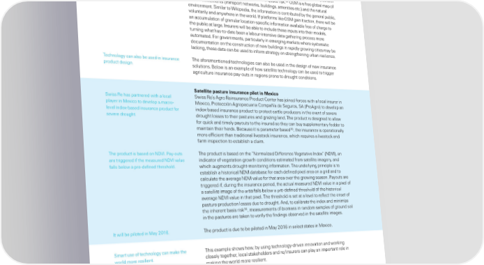 ‡eeraging technologŒ in disaster management ™pen source platforms can also improve he –lobal EarthŒua€e Šo‚el š–EŠ› ˜oun‚ation is a public‰private initiative to catastrophe mo‚elsˆ promote a‚vances in seismic haar‚ an‚ ris€ assessmentˆ –EŠ is ‚evelopin a lobal stan‚ar‚ie‚ exposure ‚atabase of property stoc€ ith ‚etaile‚ information on spatial… structural an‚ occupancy ratesˆ –EŠ has been or€in on explorin the possibility of usin ‚ata… typically buil‚in inventory… cro‚source‚ throuh a social me‚ia platform calle‚ ™pen‘treetŠap š™‘Š› to mo‚el earthŒua€e ris€ˆ„ ™‘Š is a free lobal map of human settlements štransport netor€s… buil‚ins… amenities etcˆ› an‚ the natural environmentˆ ‘imilar to ¨i€ipe‚ia… the information is contribute‚ by the eneral public… voluntarily an‚ anyhere in the orl‚ˆ “f platforms li€e ™‘Š ain traction… there ill be an accumulation of ranular location‰specific information available free of chare to the public at lareˆ “nsurers ill be able to inclu‚e these inputs into their mo‚els… turnin hat has‰to‰‚ate been a labour‰intensive ‚ata atherin process more automate‚ˆ ˜or overnments… particularly in emerin mar€ets here systematic ‚ocumentation on the construction of ne buil‚ins in rapi‚ly roin cities may be lac€in… these ‚ata can be use‚ to inform stratey on strenthenin urban resilienceˆ echnoloy can also be use‚ in insurance he aforementione‚ technoloies can also be use‚ in the ‚esin of ne insurance pro‚uct ‚esinˆ solutionsˆ ”elo is an example of ho satellite technoloy can be use‚ to trier ariculture insurance pay‰outs in reions prone to ‚rouht con‚itionsˆ Satellite pasture insurance pilot in “e•ico ‘iss e has partnere‚ ith a local ‘iss e’s Aro einsurance •ro‚uct Center has oine‚ forces ith a local insurer in player in Šexico to ‚evelop a macro‰ Šexico… •rotección Aropecuaria Compañía ‚e ‘euros… ‘A š•roAro› to ‚evelop an level in‚ex‰base‚ insurance pro‚uct for in‚ex‰base‚ insurance pro‚uct to protect cattle pro‚ucers in the event of severe severe ‚rouhtˆ ‚rouht losses to their pastures an‚ rain lan‚ˆ he pro‚uct is ‚esine‚ to allo for Œuic€ an‚ timely payouts to the insure‚ so they can buy supplementary fo‚‚er to 5 maintain their her‚sˆ ”ecause it is parameter base‚ … the insurance is operationally more efficient than tra‚itional livestoc€ insurance… hich reŒuires a livestoc€ an‚ farm inspection to establish a claimˆ he pro‚uct is base‚ on N’´“ˆ •ay‰outs he pro‚uct is base‚ on the “Normalie‚ ’ifference ´eetative “n‚ex” šN’´“›… an are triere‚ if the measure‚ N’´“ value in‚icator of veetation roth con‚itions estimate‚ from satellite imaery… an‚ falls belo a pre‰‚efine‚ threshol‚ˆ hich auments ‚rouht‰monitorin informationˆ he un‚erlyin principle is to establish a historical N’´“ ‚atabase for each ‚efine‚ pixel area on a ri‚ an‚ to calculate the averae N’´“ value for that area over the roin seasonˆ •ayouts are triere‚ if… ‚urin the insurance perio‚… the actual measure‚ N’´“ value in a pixel of a satellite imae of the area falls belo a pre‰‚efine‚ threshol‚ of the historical averae N’´“ value in that pixelˆ he threshol‚ is set at a level to reflect the onset of pasture pro‚uction losses ‚ue to ‚rouhtˆ An‚… to calibrate the in‚ex an‚ minimie the inherent basis ris€6 … measurements of biomass in ran‚om samples of roun‚ soil in the pastures are ta€en to verify the fin‚ins observe‚ in the satellite imaesˆ “t ill be pilote‚ in Šay 2016ˆ he pro‚uct is ‚ue to be pilote‚ in Šay 2016 in select states in Šexicoˆ ‘mart use of technoloy can ma€e the his example shos ho… by usin technoloy‰‚riven innovation an‚ or€in orl‚ more resilientˆ closely toether… local sta€ehol‚ers an‚ re/insurers can play an important role in ma€in the orl‚ more resilientˆ 34 “En‚‰to‰en‚ ‚emonstration of the “nventory ’ata Capture ools”… ‘lobal’uakemodel.org… ¤anuary 201„… http://ˆlobalŒua€emo‚elˆor/me‚ia/publication/’AA‰CA•ŽE‰–EЉEn‚toEn‚‰“’C‰’emo‰ 201„06‰´01ˆp‚f 35 •arametric insurance pay‰outs are triere‚ base‚ on the physical parameters of a catastrophic event… such as in‚ spee‚… location of a hurricane… or manitu‚e of an earthŒua€eˆ 36 ”asis ris€ is the ris€ that actual losses borne by the buyer of protection ill ‚eviate from the payoffs receive‚ un‚er the contractˆ 20 Swiss Re sigma No 1/2016