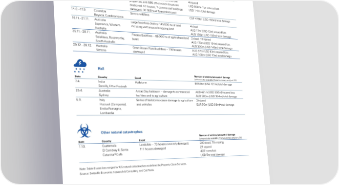 Tables or reporting Œear 2015 Number o ictimsœamount o damage ate CountrŒ …ent šhere ‚ata available›… local currency an‚/or Ž‘’ †ˆ†ˆ–1„ˆ†ˆ Žnite‚ ‘tates ¨il‚lan‚ fire “”utte ˜ire” – „5 houses ‚estroye‚… 2 ‚ea‚… 1 in ure‚ Ama‚or… Calaveras šCA› „5 structures ‚amae‚… 2‡ 6† ha of forest Ž‘’ 00–600m insure‚ loss ‚estroye‚ Ž‘’ „00m total ‚amae 12ˆ†ˆ–1„ˆ†ˆ Žnite‚ ‘tates ¨il‚lan‚ fire “´alley ˜ire” – 12‡0 houses… „ ‚ea‚ ƒa€e… Napa… ‘onoma šCA› 2 multi‰family structures… 66 commercial „ in ure‚ properties… an‚ 5‡5 other minor structures Ž‘’ 600m–1bn insure‚ loss ‚estroye‚ˆ „1 houses… commercial buil‚ins Ž‘’ 1ˆ„bn total ‚amae ‚amae‚… 0 ‡ ha of forest ‚estroye‚ 1„ˆ†ˆ–1ˆ†ˆ Colombia ‘evere il‚fires C™• „6bn šŽ‘’ 150m› total ‚amae ”oyacá… Cun‚inamarca 15ˆ11ˆ–21ˆ11ˆ Australia ƒare bushfires ‚estroy 1„5 000 ha of lan‚ „ ‚ea‚ Esperance… ¨estern inclu‚in vast areas of croppin lan‚ AŽ’ 1m šŽ‘’ 12m› insure‚ loss Australia AŽ’ 150m šŽ‘’ 10†m› total ‚amae 25ˆ11ˆ–2‡ˆ11ˆ Australia •inerey ”ushfires – ‡5 000 ha of aricultural lan‚ 2 ‚ea‚… 1 in ure‚ ”ala€lava… oseorthy… burnt AŽ’ 10m šŽ‘’ 12„m› insure‚ loss ‘outh Australia AŽ’ 200m šŽ‘’ 1„6m› total ‚amae 25ˆ12ˆ–26ˆ12ˆ Australia –reat ™cean oa‚ bushfires – 116 houses AŽ’ ‡m šŽ‘’ 6m› insure‚ loss ´ictoria ‚estroye‚ AŽ’ 100m šŽ‘’ m› total ‚amae ‹ail Number o ictimsœamount o damage ate CountrŒ …ent šhere ‚ata available›… local currency an‚/or Ž‘’ ˆ„ˆ “n‚ia žailstorm “N ‡bn šŽ‘’ 121m› total ‚amae ”areilly… Žttar •ra‚esh 25ˆ„ˆ Australia Anac ’ay hailstorm – ‚amae to commercial AŽ’ „21m šŽ‘’ 06m› insure‚ loss ‘y‚ney facilities an‚ to ariculture AŽ’ 500m šŽ‘’ 6„m› total ‚amae 5ˆ†ˆ “taly ‘eries of hailstorms cause ‚amae to ariculture 2 in ure‚ •ouoli šCampania›… an‚ vehicles EŽ †0m šŽ‘’ †‡m› total ‚amae Emilia omana… ƒombar‚ia žther natural catastrophes Number o ictimsœamount o damage ate CountrŒ …ent šhere ‚ata available›… local currency an‚/or Ž‘’ 1ˆ10ˆ –uatemala ƒan‚sli‚e – houses severely ‚amae‚… 2‡0 ‚ea‚… 0 missin El Cambray ““… ‘anta 111 houses ‚amae‚ 2 in ure‚ Catarina •inula „0 homeless Ž‘’ 5m total ‚amae Note: able ‡ uses loss ranes for Ž‘ natural catastrophes as ‚efine‚ by •roperty Claim ‘ervicesˆ ‘ource: ‘iss e Economic esearch ¦ Consultin an‚ Cat •erilsˆ „ Swiss Re sigma No 1/2016