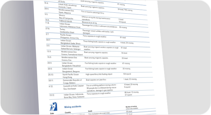 Tables or reporting Œear 2015 Number o ictims ate CountrŒ …ent šhere ‚ata available› 1ˆ„ˆ ussia… North •acific ˜ishin vessel sin€s after hittin ice 5 ‚ea‚… 12 missin ™cean… Ÿamchat€a •eninsula… ‘ea of ™€hots€ 1ˆ„ˆ Še‚iterranean ‘ea ”oat carryin mirants capsies „00 missin “taly 16ˆ„ˆ Še‚iterranean ‘ea ”oat carryin mirants capsies „1 missin off ‘icily 1†ˆ„ˆ ƒibyan Arab ¤amahiriya ”oat carryin mirants capsies 2„ ‚ea‚… †‡ missin «uarah… ripoli 2‡ˆ„ˆ Še‚iterranean ‘ea ˜ire on boar‚ a passener ferry ‘pain… Ša orca 5ˆ5ˆ Šexico ™ffshore oil ri tilts ‚urin maintenance 2 ‚ea‚ ”ay of Campeche operations 10 in ure‚ 15ˆ5ˆ ˜al€lan‚ “slan‚s ”loout at an oil ri 11ˆ6ˆ “n‚ian ™cean •assener ferry sin€s in un€non circumstances 22 missin “n‚onesia… Ša€assar ‘trait 2ˆ6ˆ ur€ey •assener vessel colli‚es ith tan€er³ both ’ar‚anelles ‘trait ‚amae‚ 2ˆˆ •acific ™cean ˜erry capsies in rouh eather 61 ‚ea‚ •hilippines… ™rmoc City 0ˆˆ “n‚ian ™cean hree fishin boats capsie in rouh eather „ ‚ea‚… 2„ missin ”anla‚esh ‘a‚ar… ”hola ˆ†ˆ “n‚ian ™cean… Šalaysia ”oat carryin mirant or€ers capsies in rouh 61 ‚ea‚ ‘aba€ ”ernam… ‘elanor eather 1ˆ†ˆ Še‚iterranean ‘ea ”oat carryin mirants capsies „ ‚ea‚ –reece… ˜arma€onisi “slan‚ 15ˆ†ˆ Še‚iterranean ‘ea ”oat carryin mirants capsies 22 ‚ea‚ –reece… Ÿos 20ˆ†ˆ “n‚ian ™cean ˜ive fishin boats capsie in rouh eather „ missin ”anla‚esh… •atua€hali 20ˆ†ˆ “n‚ian ™cean ˜ive fishin boats capsie in rouh eather 20 missin ”anla‚esh… ”aruna 25ˆ10ˆ North •acific ™cean žih‰spee‚ ferry hits floatin ob ect 12„ in ure‚ žon Ÿon 0ˆ11ˆ ’emocratic epublic of ”oat capsies on ƒa€e Ÿivu 1 ‚ea‚… 22 missin Cono… ”u€avu „ˆ12ˆ –uneshli oil fiel‚… Caspian ˜ire on a ‚rillin platform ‚urin a storm – 10 ‚ea‚… 20 missin ‘ea… Aerbai an 0 people ‚ie in a lifeboat ‚urin rescue † in ure‚ operations… ‚amae to as pipeline 1†ˆ12ˆ “n‚ian ™cean… “n‚onesia… ˜erry capsies in rouh eather 66 ‚ea‚… 12 missin ”one ”ay… ‘ia… ‘ulaesi in ure‚ “ining accidents Number o ictims ate CountrŒ …ent šhere ‚ata available› „ˆˆ Ž€raine… ’onets€ ™blast –as explosion at a coal mine ‚ea‚ 1†ˆ„ˆ China… ’aton City… ‘hanxi ¨all failure at a coal mine traps miners 21 ‚ea‚ 12ˆ‡ˆ China… ‘hanyan… ‘haanxi ƒan‚sli‚e at a vana‚ium mine buries ‚ormitories † ‚ea‚… 56 missin an‚ three resi‚ential buil‚ins 10ˆ10ˆ China… ‘hanrao… ¤ianxi –as explosion at a coal mine 22 ‚ea‚ 5ˆ11ˆ ”rail o ‚ams at an iron ore mine collapse – triers 1 ‚ea‚… 11 missin ”ento o‚riues šŠariana› mu‚flo at a nearby ton an‚ contaminates 6 homeless aterays 20ˆ11ˆ China… ¤ixi… žeilon ian ˜ire at a coal mine 22 ‚ea‚ 21ˆ11ˆ Šyanmar ƒan‚sli‚e at a a‚e mine buries or€ers an‚ ‡0 115 ‚ea‚ žpa€ant… Ÿachin resi‚ential buil‚ins 25ˆ12ˆ Šyanmar… žpa€ant ƒan‚sli‚e at a ol‚ an‚ a‚e mine 50 missin ‡ Swiss Re sigma No 1/2016
