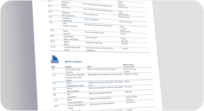 Number o ictims ate CountrŒ …ent šhere ‚ata available› „ˆ11ˆ •a€istan ‘hoppin bas factory buil‚in collapses „5 ‚ea‚ ƒahore 10 in ure‚ 15ˆ11ˆ Šalta –lass banister in a nihtclub collapses 1 in ure‚ ´alletta 2„ˆ11ˆ Aleria ˜ire in a mirant camp 1‡ ‚ea‚ ™uarla 50 in ure‚ 25ˆ11ˆ •hilippines ˜ire in a shanty ton… ‚estroys ‡00 houses 2500 homeless Šanila 2†ˆ11ˆ ‘outh Africa ˜ire in a shanty ton ‚estroys 1000 homes 2 ‚ea‚ „000 homeless „ˆ12ˆ •hilippines ˜ire in a shanty ton 5000 homeless ‘taˆ Cru… Šanila 5ˆ12ˆ Aerbai an ˜ire at an oil platform ‚ea‚… 2 missin Caspian ‘ea ˆ12ˆ “n‚ia ˜ire an‚ as explosions in a shanty ton 2 ‚ea‚ Ÿan‚ivali… Šumbai 11 in ure‚ 000 homeless 1ˆ12ˆ ussia ˜ire at a psychiatric hospital 2 ‚ea‚ ´oroneh 2„ˆ12ˆ ‘au‚i Arabia ˜ire at a hospital 2„ ‚ea‚ ¤aan… ¤ian eion 12 in ure‚ 2„ˆ12ˆ Nieria Explosion at a as plant 100 ‚ea‚ Nnei 1ˆ12ˆ Žnite‚ Arab Emirates ˜ire at a hotel at time of Ne µear’s Eve 1„ in ure‚ ’ubai celebrations “aritime disasters Number o ictims ate CountrŒ …ent šhere ‚ata available› 2ˆ1ˆ North •acific ™cean ”ul€ carrier sin€s off the coast of ´ietnam 2 ‚ea‚… 16 missin ´un au 1 in ure‚ 1ˆ1ˆ Central African epublic ”oat catches fire an‚ capsies on iver ™ubanui 10‡ ‚ea‚… 1„ missin N‚imba… „2 €m from ”anui 16ˆ1ˆ China uboat sin€s ‚urin a trial voyae on the µante 22 ‚ea‚ «han iaan… ¤iansu iver ˆ2ˆ µemen ”oat carryin mirants capsies in rouh eather 5 missin ”ab el‰Šan‚eb ‡ˆ2ˆ “taly ”oat carryin mirants capsies 00 ‚ea‚ ƒampe‚usa 11ˆ2ˆ ”rail Explosion at a ‚rillin platform 6 ‚ea‚… missin Espirito ‘anto ”asin 10 in ure‚ 1„ˆ2ˆ ’emocratic epublic of ”oat capsies on ƒa€e ananyi€a 100 missin Cono ƒa€e ananyi€a 22ˆ2ˆ ”anla‚esh •assener ferry sin€s in the iver •a‚ma after 0 ‚ea‚ Šani€an ‚istrict bein hit by a caro vessel 1ˆˆ Šyanmar… “n‚ian ™cean •assener ferry capsies in rouh eather „ ‚ea‚… 12 missin Naun ’a –yi “slan‚ 2‡ˆˆ –reece ˜ire onboar‚ a hih‰spee‚ ferry hile ‚oc€e‚ at 1 ‚ea‚ ’rapetsona shipyar‚ 1ˆ„ˆ Šexico ˜ire an‚ explosion on a ‚rillin platform „ ‚ea‚ ”ay of Campeche 16 in ure‚ Swiss Re sigma No 1/2016