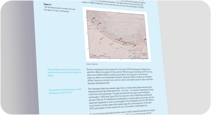 Regional oeriew ‡iing on the edge: earthˆua‰e haŠard emanating rom the ‹imalaŒan region he žimalayas are one of the orl‚’s he žimalayas… forme‚ by the continental collision of the “n‚ian an‚ Eurasian plates… most seismically haar‚ous reionsˆ have the hihest mountain pea€s in the orl‚ˆ he reion is also one of the most seismically active loballyˆ his is because the northboun‚ un‚er‰thrustin of the “n‚ia plate beneath the Eurasia plate continues to‚ay… at a rate of –„ centimeters per yearˆ he map belo shos the alinment of more recent earthŒua€es alon the plate boun‚ary line… runnin from Assam in the east šhere there as an Š ‡ˆ6 Œua€e in 1†50› to Ÿashmir in the est šthe site of an Š ˆ6 earthŒua€e in 2005›ˆ Figure 5 he žimalayan plate boun‚ary line an‚ the ‚ates of ma or earthŒua€es ‘ource: ‘iss eˆ houh 50 €m aay from the epicentre… remors oriinatin from the epicentre of the April 2015 earthŒua€e in Nepal ere ’elhi felt the tremors of the April Œua€e in also felt in ’elhi… the capital of “n‚ia… almost 50 €m aayˆ Accor‚in to 2011 census Nepalˆ ‚ata… aroun‚ †0§ of ’elhi’s buil‚in stoc€ falls in the cateory of unreinforce‚ masonry… hich is not earthŒua€e resistantˆ Šoreover… ’elhi is locate‚ on the ban€s of iver µamuna on a be‚ of very soft soil… hich can amplify seismic aves an‚ their ‚amae‰causin potentialˆ he presence of a seismic ap in central he žimalayan plate has a seismic ap… that is… an area here plate movement has žimalayas is a ris€ for ’elhiˆ alrea‚y pro‚uce‚ lan‚ ‚eformation but – as of yet – no release of associate‚ enery in the form of an earthŒua€eˆ he ap exten‚s from the reion near the Ÿanra earthŒua€e in 1†05 šsee ˜iure 5› to the epicentre of the 1†„ Nepal earthŒua€e šaroun‚ 00 €m›ˆ he li€elihoo‚ of earthŒua€es in seismic aps is very hih… an‚ the expecte‚ manitu‚e of such an earthŒua€e in the žimalayas is Š ‡ˆ0–‡ˆ5ˆ ’elhi is much closer to certain areas of the seismic ap than to the epicentre of the April 2015 earthŒua€eˆ “n other or‚s… the city is vulnerable to earthŒua€e ris€ˆ he economic loss from a ma or o assess the loss potential of such an event in ’elhi… ‘iss e simulate‚ the impact earthŒua€e near ’elhi coul‚ amount to of an earthŒua€e of Š ‡ˆ0 manitu‚e ust 1†0 €m aay from the city… ith its as much as Ž‘’ „ billionˆ epicentre in the žimalayan seismic ap… usin the proprietary Šulti‘NA• toolˆ he simulation assume‚ an insurance penetration rate in ’elhi of 1ˆ„§ˆ† he outcome as a total economic loss of at least “N 20 billion šŽ‘’ „ billion›… ith insure‚ losses of aroun‚ “N 25ˆ2 billion šŽ‘’ „00 million›ˆ An‚… ’elhi is one of “n‚ia’s most populous cityˆ A lare earthŒua€e there oul‚ li€ely also mean lare loss of lifeˆ 9 Indian non-life insurance industry yearbook 2014–15… –eneral “nsurance Council… 2015ˆ https://ˆicouncilˆin/‚onloa‚sˆaspx 10 Swiss Re sigma No 1/2016