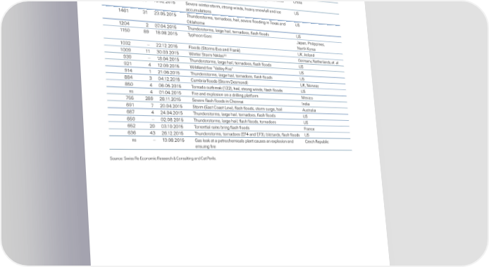 Tables or reporting Œear 2015 ‚” Table ’ he 20 most costly insurance losses in 2015‡ „nsured loss šin Ž‘’ m› †ictims‡ ate šstart› …ent CountrŒ 2500 to 1 12ˆ0‡ˆ2015 •ort of ian in ‰ explosions at a arehouse storin haar‚ous China 500 chemicals 20‡1 0 16ˆ02ˆ2015 ‘evere inter storm… stron in‚s… heavy snofall an‚ ice Ž‘ accumulations 1„61 1 2ˆ05ˆ2015 hun‚erstorms… torna‚oes… hail… severe floo‚in in exas an‚ Ž‘ ™€lahoma 120„ 2 0ˆ0„ˆ2015 hun‚erstorms… lare hail… torna‚oes… flash floo‚s Ž‘ 1150 ‡† 1‡ˆ0‡ˆ2015 yphoon –oni ¤apan… •hilippines… North Ÿorea 102 – 22ˆ12ˆ2015 ˜loo‚s š‘torms Eva an‚ ˜ran€› ŽŸ… “relan‚ 100† 11 0ˆ0ˆ2015 ¨inter ‘torm Ni€las† –ermany… Netherlan‚s… etˆ alˆ †† – 1‡ˆ0„ˆ2015 hun‚erstorms… lare hail… torna‚oes… flash floo‚s Ž‘ †21 „ 12ˆ0†ˆ2015 ¨il‚lan‚ fire “´alley ˜ire” Ž‘ †1„ 1 21ˆ06ˆ2015 hun‚erstorms… lare hail… torna‚oes… flash floo‚s Ž‘ ‡‡„ 0„ˆ12ˆ2015 Cumbria floo‚s š‘torm ’esmon‚› ŽŸ… Noray ‡50 „ 06ˆ05ˆ2015 orna‚o outbrea€ š122›… hail… stron in‚s… flash floo‚s Ž‘ ns „ 01ˆ0„ˆ2015 ˜ire an‚ explosion on a ‚rillin platform Šexico 55 2‡† 2‡ˆ11ˆ2015 ‘evere flash floo‚s in Chennai “n‚ia 6†1 20ˆ0„ˆ2015 ‘torm šEast Coast ƒo›… flash floo‚s… storm sure… hail Australia 6‡ „ 2„ˆ0„ˆ2015 hun‚erstorms… lare hail… torna‚oes… flash floo‚s Ž‘ 65† – 02ˆ0‡ˆ2015 hun‚erstorms… lare hail… flash floo‚s… torna‚oes Ž‘ 652 20 0ˆ10ˆ2015 orrential rains brin flash floo‚s ˜rance 66 „ 26ˆ12ˆ2015 hun‚erstorms… torna‚oes šE˜„ an‚ E˜›… bliar‚s… flash floo‚s Ž‘ ns – 1ˆ0‡ˆ2015 –as lea€ at a petrochemicals plant causes an explosion an‚ Cech epublic ensuin fire ‘ource: ‘iss e Economic esearch ¦ Consultin an‚ Cat •erilsˆ† 37 •roperty an‚ business interruption… exclu‚in liability an‚ life insurance losses³ Ž‘ natural catastrophe fiures base‚ on •roperty Claim ‘ervices… inclu‚in National ˜loo‚ “nsurance •roram šN˜“•› losses šsee pae „… “erms an‚ selection criteria” section› 38 ’ea‚ an‚ missinˆ 39 ƒoss numbers for ‘torm Ni€las are ‘iss e estimates base‚ on ‚ata from •erils A–ˆ 22 Swiss Re sigma No 1/2016