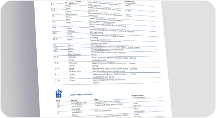 Table € Chronoloical list of all man‰ma‚e ‚isasters 2015 ™iation disasters Number o ictims ate CountrŒ …ent šhere ‚ata available› 1‡ˆ1ˆ ‘yrian Arab epublic ‘yrian Air ˜orce Antonov 26 plane crashes on 0 ‚ea‚ Abu a‚h ’huhur lan‚in approach „ˆ2ˆ aian ransAsia Airays A 2‰600 plane crashes „ ‚ea‚ aipei after ta€e off 2„ˆˆ ˜rance –ermanins Airbus A20‰211 crashes ‚ue to 150 ‚ea‚ ”arcelonnette pilot suici‚e 2ˆ„ˆ µemen µemenia ”oein „‘• ‚estroye‚ ‚urin a un A‚en battle at A‚en “nternational Airport 12ˆ„ˆ ‘pace ƒoss of contact ith Eypt‰‘at 2… a remote sensin satellite 1„ˆ„ˆ ¤apan Asiana Airlines Airbus A20‰22 plane ritten off 2 in ure‚ žiroshima after har‚ lan‚in 25ˆ„ˆ ur€ey A ur€ish Airlines Airbus A20‰22 catches fire “stanbul on lan‚in 2‡ˆ„ˆ ‘pace ussian “‘‘ resupply craft lost ‚ue to early separation from roc€et †ˆ5ˆ ‘pace Airbus A„00Š plane crashes ‚urin a test fliht „ ‚ea‚… 2 in ure‚ 16ˆ5ˆ ‘pace Šexsat satellite crashes ‚ue to faulty launch 2‡ˆ6ˆ ‘pace NA‘A “‘‘ resupply roc€et explo‚es shortly after Cape Canaveral launch 0ˆ6ˆ “n‚onesia N“‰AŽ ƒoc€hee‚ C‰10” žercules plane crashes 1† ‚ea‚ Še‚an shortly after ta€eoff 16ˆ‡ˆ “n‚onesia riana Air ‘ervice A „2‰00 crashes before 5„ ‚ea‚ ™€sibil lan‚in 1ˆ10ˆ Eypt Šetro et Airbus A21‰21 plane crashes shortly 22„ ‚ea‚ Al‰Arish… ‘inai after ta€eoff allee‚ly ‚ue to bomb onboar‚ „ˆ11ˆ ‘u‚an Allie‚ ‘ervices ƒt‚ Antonov 12”Ÿ caro plane „1 ‚ea‚ ¤uba crashes shortly after ta€eoff 21ˆ11ˆ ‘pace ƒoss of contact ith Amos 5… a commercial satellite “aŽor ires˜ e•plosions Number o ictims ate CountrŒ …ent šhere ‚ata available› 10ˆ1ˆ Žnite‚ ‘tates… ™hio Explosion an‚ fire at an oil refinery 10ˆ1ˆ ‘outh Ÿorea ˜ire at a multi‰storey apartment bloc€ 5 ‚ea‚ Ži eonbu 125 in ure‚ 11ˆ1ˆ ”anla‚esh ˜ire in a shanty ton 2 ‚ea‚ ’ha€a 2000 homeless 2†ˆ1ˆ Šexico –as lea€ causes an explosion at a chil‚ren’s 2 ‚ea‚ Šexico City hospital 2 in ure‚ 5ˆ2ˆ ŽŸ ˜ire at an electrical plant ‘taverton 16ˆ2ˆ –ermany ˜ire at an animal fee‚ factory echterfel‚ ˆˆ Žnite‚ ‘tates ˜ire at a lass‰ma€in facility ’uryea… •A 11ˆˆ ussia ˜ire at a shoppin centre 1 ‚ea‚ Ÿaan 55 in ure‚ 12ˆˆ ”anla‚esh Žn‚er‰construction roof at a cement factory 5 ‚ea‚ Šonla… ”aerhat collapses 50 in ure‚ Swiss Re sigma No 1/2016 5