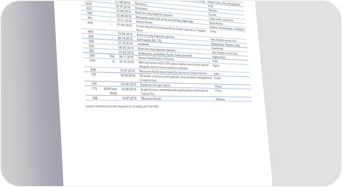 Table ” he 20 orst catastrophes in terms of victims 2015 „nsured losses †ictimsƒ0 šin Ž‘’ m› ate šstart› …ent CountrŒœregion ‡†60 160 25ˆ0„ˆ2015 EarthŒua€e šŠ ˆ‡›… avalanche on Šount Everest… aftershoc€s Nepal… “n‚ia… China… ”anla‚esh 22„‡ – 21ˆ05ˆ2015 žeatave “n‚ia 120 – 01ˆ06ˆ2015 žeatave •a€istan 1200 – 2†ˆ0ˆ2015 žeatave Europe ‡22 – 1†ˆ0„ˆ2015 ”oat carryin mirants capsies ƒibyan Arab ¤amahiriya 6† – 2ˆ0†ˆ2015 ‘tampe‚e an‚ crush at the annual ža pilrimae ‘au‚i Arabia „51 – 12ˆ01ˆ2015 ‘evere floo‚s Šalai… ŠoambiŒue… «imbabe „„2 – 01ˆ06ˆ2015 Cruise ship hit by stron in‚s an‚ rains capsies on µante China iver „00 – 1ˆ0„ˆ2015 ”oat carryin mirants capsies “taly… Še‚iterranean ‘ea †† – 26ˆ10ˆ2015 EarthŒua€e šŠ ˆ5› Afhanistan… •a€istan… “n‚ia 50 – 01ˆ10ˆ2015 ƒan‚sli‚e –uatemala 00 – 0‡ˆ02ˆ2015 ”oat carryin mirants capsies “taly… Še‚iterranean ‘ea 2†1 – 01ˆ02ˆ2015 Avalanches… lan‚sli‚es… floo‚s… heavy snofall Afhanistan 2‡† 55 2‡ˆ11ˆ2015 ‘evere flash floo‚s in Chennai “n‚ia 22„ ns 1ˆ10ˆ2015 Šetro et Airbus A21‰21 plane crashes shortly after ta€eoff Eypt allee‚ly ‚ue to bomb explosion onboar‚ 206 – 15ˆ0ˆ2015 Šonsoon floo‚s exacerbate‚ by tail en‚ of Cyclone Ÿomen “n‚ia 1† – 16ˆ0†ˆ2015 ™il tan€er overturns an‚ explo‚es³ local resi‚ents ha‚ athere‚ ‘u‚an to siphon fuel 1†0 – 0„ˆ06ˆ2015 Explosion at a as station –hana 1 2500 an‚ 12ˆ0‡ˆ2015 Explosions at a arehouse storin haar‚ous chemicals at China 500 ian in •ort 166 – 15ˆ0ˆ2015 Šonsoon floo‚s •a€istan ‘ource: ‘iss e Economic esearch ¦ Consultin an‚ Cat •erilsˆ 40 ’ea‚ an‚ missinˆ Swiss Re sigma No 1/2016 2