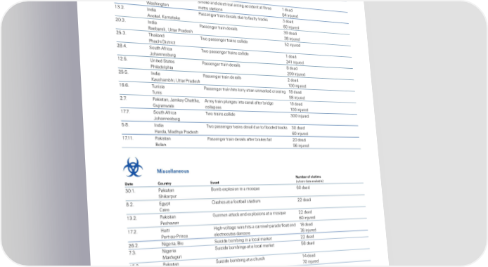 Rail disasters˜ including cablewaŒs Number o ictims ate CountrŒ …ent šhere ‚ata available› 6ˆ1ˆ ”rail rain at a station hit from behin‚ by another train 15‡ in ure‚ ŠesŒuita… io ‚e ¤aneiro 12ˆ1ˆ Žnite‚ ‘tates ‘mo€e an‚ electrical arcin acci‚ent at three 1 ‚ea‚ ¨ashinton metro stations ‡„ in ure‚ 1ˆ2ˆ “n‚ia •assener train ‚erails ‚ue to faulty trac€s ‚ea‚ Ane€al… Ÿarnata€a 60 in ure‚ 20ˆˆ “n‚ia •assener train ‚erails † ‚ea‚ aebareli… Žttar •ra‚esh ‡ in ure‚ 25ˆˆ hailan‚ o passener trains colli‚e 52 in ure‚ •hachi ’istrict 2‡ˆ„ˆ ‘outh Africa o passener trains colli‚e 1 ‚ea‚ ¤ohannesbur 2„1 in ure‚ 12ˆ5ˆ Žnite‚ ‘tates •assener train ‚erails ‡ ‚ea‚ •hila‚elphia 200 in ure‚ 25ˆ5ˆ “n‚ia •assener train ‚erails 2 ‚ea‚ Ÿaushambhi… Žttar •ra‚esh 100 in ure‚ 16ˆ6ˆ unisia •assener train hits lorry at an unmar€e‚ crossin 1‡ ‚ea‚ unis †‡ in ure‚ 2ˆˆ •a€istan… ¤am€ey Chattha… Army train plunes into canal after bri‚e 1† ‚ea‚ –u ranala collapses 100 in ure‚ 1ˆˆ ‘outh Africa o trains colli‚e 00 in ure‚ ¤ohannesbur 5ˆ‡ˆ “n‚ia o passener trains ‚erail ‚ue to floo‚e‚ trac€s 0 ‚ea‚ žar‚a… Ša‚hya •ra‚esh 60 in ure‚ 1ˆ11ˆ •a€istan •assener train ‚erails after bra€es fail 20 ‚ea‚ ”olan †6 in ure‚ “iscellaneous Number o ictims ate CountrŒ …ent šhere ‚ata available› 0ˆ1ˆ •a€istan ”omb explosion in a mosŒue 60 ‚ea‚ ‘hi€arpur ‡ˆ2ˆ Eypt Clashes at a football sta‚ium 22 ‚ea‚ Cairo 1ˆ2ˆ •a€istan –unmen attac€ an‚ explosions at a mosŒue 22 ‚ea‚ •eshaar 60 in ure‚ 1ˆ2ˆ žaiti žih‰voltae ire hits a carnival‰para‚e float an‚ 1‡ ‚ea‚ •ort‰au‰•rince electrocutes ‚ancers ‡ in ure‚ 26ˆ2ˆ Nieria… ”iu ‘uici‚e bombin in a local mar€et 22 ‚ea‚ ˆˆ Nieria ‘uici‚e bombins at a local mar€et 5‡ ‚ea‚ Šai‚uuri 15ˆˆ •a€istan ‘uici‚e bombin at a church 1„ ‚ea‚ ƒahore 0 in ure‚ 1‡ˆˆ unisia –unmen attac€s at ”ar‚o National Šuseum 22 ‚ea‚ unis „0 in ure‚ 26ˆˆ ‘omalia –unmen attac€s at a hotel 2„ ‚ea‚ Šoa‚ishu 1ˆ„ˆ Ÿenya –unmen attac€s at Žniversity 1„‡ ‚ea‚ –arissa 6ˆ„ˆ Nieria Šass shootin at a mosŒue 2„ ‚ea‚ Ÿa affa 11ˆ„ˆ •a€istan Šass shootin at a construction site 20 ‚ea‚ ”aluchistan Swiss Re sigma No 1/2016 †