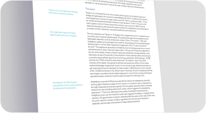 ian in: a pule of ris€ accumulation an‚ coverae terms he explosions in ian in in 2015 ™n 12 Auust 2015… to massive explosions at a arehouse in the •ort of ian in in enerate‚ accumulate‚ losses across China claime‚ 1 victims… in ure‚ close to ‡00… an‚ cause‚ lare‰scale ‚amae to multiple lines of insurance businessˆ surroun‚in property an‚ infrastructureˆ he severity of the blasts an‚ lare asset exposures at the time mean that the ian in event is the biest man‰ma‚e insurance loss event ever recor‚e‚ in Asiaˆ he i‚e rane of insurance policies impacte‚ by the explosions… an‚ the complexity of interpretation of coverae beteen policy classes… ma€e for an interestin case stu‚yˆ he ian in experience also puts a spotliht on ris€ accumulation controls at ma or tra‚in hubs an‚ in‚ustrial par€sˆ he event ian in’s port is the ateay to ”ei in ian in is in northeast Chinaˆ “t is the closest startin point to the Asia‰Europe lan‚ an‚ China’s in‚ustrial northeastˆ bri‚e an‚ ateay to the country’s capital ”ei inˆ “n 201… it ran€e‚ as the orl‚’s 1 thir‚ larest port in terms of caro volume an‚ the 10th for container trafficˆ “t has 2 an in‚ustrial an‚ petrochemicals complex coverin about 115 €m ˆ he port is the main loistics hub for China’s automotive in‚ustry… accountin for „0§ of all car imports an‚ exports… an‚ serves the same function for components an‚ materials for a number of other in‚ustries… inclu‚in healthcare an‚ electronicsˆ o hue blasts rippe‚ throuh a he to explosions at ian in on 12 Auust ere triere‚ by a fire in a arehouse in loistics par€ at the port in Auustˆ one of the port’s several loistics par€sˆ he arehouse as storin haar‚ous an‚ 1„ flammable materials… such as ammonium nitrateˆ ™f the 1 victims … 10„ ere firefihters calle‚ out to extinuish the initial fireˆ Accor‚in to the China EarthŒua€e A‚ministration… the first blast reistere‚ a manitu‚e of Š 2ˆ an‚ the secon‚ Š 15 2ˆ†ˆ he explosions enerate‚ a fireball an‚ sent shoc€aves across an area of several‰€ilometre ra‚ius… leavin a lare crater in the roun‚ˆ •roperties a‚ acent to the site of the blasts… mostly container yar‚s an‚ automotive storae facilities… ere ‚estroye‚… as ere thousan‚s of ne vehicles in transit par€e‚ nearbyˆ Accor‚in to a recently issue‚ official report from the Chinese authorities… 0„ buil‚ins… 12 „2‡ 16 vehicles an‚ 5 containers ere ‚estroye‚ˆ “n a‚‚ition… ‚ue to the sheer intensity of the blasts… thousan‚s of vehicles an‚ properties ithin a 5 €m ra‚ius sustaine‚ ‚amae ranin from severe to non‰structural še… shattere‚ in‚os or ust ‚ust cover›ˆ “nsurers estimate the total number of affecte‚ cars to be a multiple of the 12 „2‡ mentione‚ in the official reportˆ “ronically… the port’s shippin terminals ere larely unscathe‚ˆ As the blasts happene‚ in one of many storae an‚ loistic operations areas… overall port activity as shut ‚on for a fe ‚ays onlyˆ Accor‚in to the official report… Accor‚in to reports of official sources… the fire starte‚ in a arehouse after the auto‰inition of nitro‰cotton spar€e‚ a ettin aent €eepin a supply of nitro‰cotton in a container ‚amp… evaporate‚ in fire that le‚ to the explosionsˆ the hih temperatures an‚ auto‰inite‚ˆ he fire Œuic€ly sprea‚ to other chemicals store‚ at the site inclu‚in ammonium nitrate… hich triere‚ the ‚evastatin 1 explosionsˆ here is an alternative an‚ i‚ely‰hel‚ belief that attempts by firefihters to put out the initial fire coul‚ have triere‚ the blasts or manifie‚ their intensityˆ he overnment… hoever… maintains that this as not the caseˆ Either ay… the event calls for a revie of safety reulations for the storin of haar‚ous materials… an‚ stroner enforcement of associate‚ proce‚uresˆ 13 orld ort anking 201 … American Association of •ort Authorities http://ˆaapa‰portsˆor/“n‚ustry/contentˆcfm¹“temNumber¬†00¾‘tatistics 14 165 people ere €ille‚ an‚ eiht are still missinˆ ‘ee A ’uc€ett… “ian in blast blame‚ on mismanaement”… €e ‚€emical ƒngineer… ‡ ˜ebruary 2016… http://ˆtceto‚ayˆcom/latest§20nes/2016/february/tian in‰blast‰blame‚‰on‰mismanaementˆ aspx¾ˆ´rn2c½2a1 15 “‘tatement of Šr •u µun ¿iao… member of the China EarthŒua€e A‚ministration”… as reporte‚ in “ ”… „in€ua… 1 Auust… 2015… http://nesˆxinhuanetˆcom/science/2015‰ ‡/1/c½1„511†61ˆhtm 16 “ian in blast probe suests action aainst 12 people”… „in€ua… 5 ˜ebruary 2016… http://nesˆ xinhuanetˆcom/enlish/2016‰02/05/c½150‡†0ˆhtm 17 A ’uc€ett… opˆ citˆ Swiss Re sigma No 1/2016 1