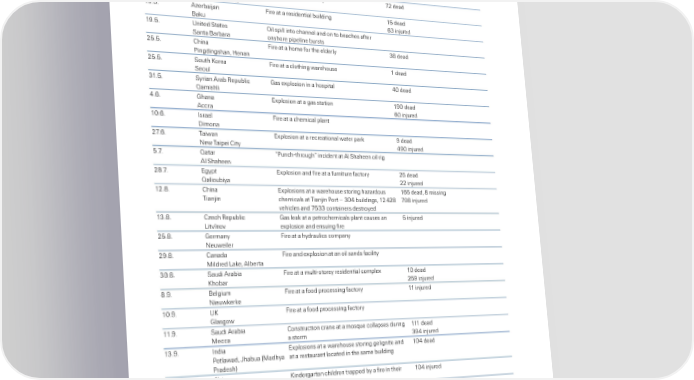 Tables or reporting Œear 2015 Number o ictims ate CountrŒ …ent šhere ‚ata available› 1†ˆ„ˆ ”rail ˜ire at a pharmaceuticals company ‘ao •aulo 2†ˆ„ˆ ŽŸ ˜ire at a heritae palace –uil‚for‚… ‘urrey 1„ˆ5ˆ •hilippines ˜ire at a footear factory 2 ‚ea‚ ´alenuela… Šanila 1†ˆ5ˆ Aerbai an ˜ire at a resi‚ential buil‚in 15 ‚ea‚ ”a€u 6 in ure‚ 1†ˆ5ˆ Žnite‚ ‘tates ™il spill into channel an‚ on to beaches after ‘anta ”arbara onshore pipeline bursts 25ˆ5ˆ China ˜ire at a home for the el‚erly ‡ ‚ea‚ •in‚inshan… ženan 25ˆ5ˆ ‘outh Ÿorea ˜ire at a clothin arehouse 1 ‚ea‚ ‘eoul 1ˆ5ˆ ‘yrian Arab epublic –as explosion in a hospital „0 ‚ea‚ ¿amishli „ˆ6ˆ –hana Explosion at a as station 1†0 ‚ea‚ Accra 60 in ure‚ 10ˆ6ˆ “srael ˜ire at a chemical plant ’imona 2ˆ6ˆ aian Explosion at a recreational ater par€ † ‚ea‚ Ne aipei City „†0 in ure‚ 5ˆˆ ¿atar “•unch‰throuh” inci‚ent at Al ‘haheen oil ri Al ‘haheen 2‡ˆˆ Eypt Explosion an‚ fire at a furniture factory 25 ‚ea‚ ¿alioubiya 22 in ure‚ 12ˆ‡ˆ China Explosions at a arehouse storin haar‚ous 165 ‚ea‚… ‡ missin ian in chemicals at ian in •ort – 0„ buil‚ins… 12 „2‡ †‡ in ure‚ vehicles an‚ 5 containers ‚estroye‚ 1ˆ‡ˆ Cech epublic –as lea€ at a petrochemicals plant causes an 5 in ure‚ ƒitvínov explosion an‚ ensuin fire 25ˆ‡ˆ –ermany ˜ire at a hy‚raulics company Neueiler 2†ˆ‡ˆ Cana‚a ˜ire an‚ explosion at an oil san‚s facility Šil‚re‚ ƒa€e… Alberta 0ˆ‡ˆ ‘au‚i Arabia ˜ire at a multi‰storey resi‚ential complex 10 ‚ea‚ Ÿhobar 25† in ure‚ ‡ˆ†ˆ ”elium ˜ire at a foo‚ processin factory 11 in ure‚ Nieu€er€e 10ˆ†ˆ ŽŸ ˜ire at a foo‚ processin factory –laso 11ˆ†ˆ ‘au‚i Arabia Construction crane at a mosŒue collapses ‚urin 111 ‚ea‚ Šecca a storm †„ in ure‚ 1ˆ†ˆ “n‚ia Explosions at a arehouse storin elinite an‚ 10„ ‚ea‚ •etlaa‚… ¤habua šŠa‚hya at a restaurant locate‚ in the same buil‚in •ra‚esh› 16ˆ†ˆ China Ÿin‚erarten chil‚ren trappe‚ by a fire in their 10„ in ure‚ Nin‚e City… ˜u ian buil‚in 0ˆ†ˆ Netherlan‚s ˜ire at a chemical plant –eleen 1†ˆ10ˆ Ž€raine ˜ire an‚ explosion at an ammunition ‚epot „ ‚ea‚ ‘vatovo ‚estroy or ‚amae 10† houses 5„ in ure‚ 0‡2 homeless 2ˆ10ˆ Žnite‚ ‘tates ƒare as lea€ at a storae facility – state of 660 in ure‚ Aliso Canyon emerency ‚eclare‚ 2 months after inci‚ent… 5„ househol‚s temporarily relocate‚ 0ˆ10ˆ omania ˜ire at a nihtclub… triere‚ by fireor€s 56 ‚ea‚ ”ucharest 166 in ure‚ 6 Swiss Re sigma No 1/2016