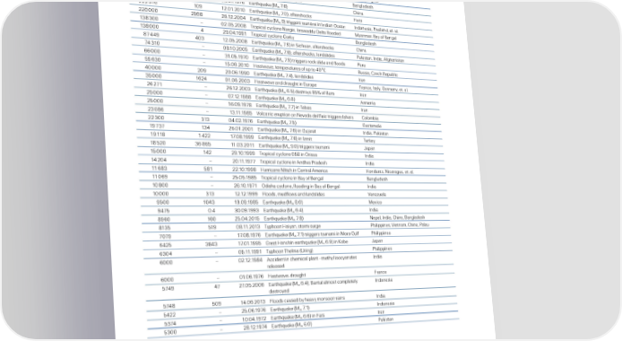 Tables or reporting Œear 2015 Table 11 he „0 orst catastrophes in terms of victims š1†0–2015› „6 „nsured loss šŽ‘’ m… „5 †ictims in‚exe‚ to 2015› Start date …ent CountrŒœregion 00 000 – 11ˆ11ˆ1†0 ‘torm an‚ floo‚ catastrophe ”anla‚esh 255 000 – 2‡ˆ0ˆ1†6 EarthŒua€e šŠ ˆ6› China 222 50 10† 12ˆ01ˆ2010 EarthŒua€e šŠ ˆ0›… aftershoc€s žaiti 220 000 250‡ 26ˆ12ˆ200„ EarthŒua€e šŠ †› triers tsunami in “n‚ian ™cean “n‚onesia… hailan‚… etˆ alˆ 1‡ 00 – 02ˆ05ˆ200‡ ropical cyclone Naris… “rraa‚‚y ’elta floo‚e‚ Šyanmar… ”ay of ”enal 1‡ 000 „ 2†ˆ0„ˆ1††1 ropical cyclone –or€y ”anla‚esh ‡ „„† „0 12ˆ05ˆ200‡ EarthŒua€e šŠ ˆ†› in ‘ichuan… aftershoc€s China „ 10 – 0‡ˆ10ˆ2005 EarthŒua€e šŠ ˆ6›³ aftershoc€s… lan‚sli‚es •a€istan… “n‚ia… Afhanistan 66 000 – 1ˆ05ˆ1†0 EarthŒua€e šŠ ˆ†› triers roc€ sli‚e an‚ floo‚s •eru 55 60 – 15ˆ06ˆ2010 žeatave… temperatures of up to „0°C ussia… Cech epublic „0 000 20† 20ˆ06ˆ1††0 EarthŒua€e šŠ ˆ„›… lan‚sli‚es “ran 5 000 162„ 01ˆ06ˆ200 žeatave an‚ ‚rouht in Europe ˜rance… “taly… –ermany… etˆ alˆ 26 21 – 26ˆ12ˆ200 EarthŒua€e šŠ 6ˆ5› ‚estroys ‡5§ of ”am “ran 25 000 – 0ˆ12ˆ1†‡‡ EarthŒua€e šŠ 6ˆ‡› Armenia 25 000 – 16ˆ0†ˆ1†‡ EarthŒua€e šŠ ˆ› in abas “ran 2 0‡6 – 1ˆ11ˆ1†‡5 ´olcanic eruption on Neva‚o ‚el ui triers lahars Colombia 22 00 1 0„ˆ02ˆ1†6 EarthŒua€e šŠ ˆ5› –uatemala 1† 1„ 26ˆ01ˆ2001 EarthŒua€e šŠ ˆ6› in –u arat “n‚ia… •a€istan 1† 11‡ 1 „22 1ˆ0‡ˆ1††† EarthŒua€e šŠ ˆ6› in “mit ur€ey 1‡ 520 6 ‡65 11ˆ0ˆ2011 EarthŒua€e šŠ †ˆ0› triers tsunami ¤apan 15 000 1„2 2†ˆ10ˆ1††† ropical cyclone 05” in ™rissa “n‚ia 1„ 20„ – 20ˆ11ˆ1† ropical cyclone in An‚hra •ra‚esh “n‚ia 11 6‡ 5‡1 22ˆ10ˆ1††‡ žurricane Šitch in Central America žon‚uras… Nicaraua… etˆ alˆ 1106† – 25ˆ05ˆ1†‡5 ropical cyclone in ”ay of ”enal ”anla‚esh 10 ‡00 – 26ˆ10ˆ1†1 ™‚isha cyclone… floo‚in in ”ay of ”enal “n‚ia 10 000 1 12ˆ12ˆ1††† ˜loo‚s… mu‚flos an‚ lan‚sli‚es ´eneuela †500 10„ 1†ˆ0†ˆ1†‡5 EarthŒua€e šŠ ‡ˆ0› Šexico †„5 0ˆ„ 0ˆ0†ˆ1†† EarthŒua€e šŠ 6ˆ„› “n‚ia ‡†60 160 25ˆ0„ˆ2015 EarthŒua€e šŠ ˆ‡› Nepal… “n‚ia… China… ”anla‚esh ‡15 51† 0‡ˆ11ˆ201 yphoon žaiyan… storm sure •hilippines… ´ietnam… China… •alau 0† – 1ˆ0‡ˆ1†6 EarthŒua€e šŠ ˆ1› triers tsunami in Šoro –ulf •hilippines 6„25 ‡„ 1ˆ01ˆ1††5 –reat žanshin earthŒua€e šŠ 6ˆ†› in Ÿobe ¤apan 60„ – 05ˆ11ˆ1††1 yphoon helma šŽrin› •hilippines 6000 – 02ˆ12ˆ1†‡„ Acci‚ent in chemical plant ‰ methyl isocyanates “n‚ia release‚ 6000 – 01ˆ06ˆ1†6 žeatave… ‚rouht ˜rance 5„† „ 2ˆ05ˆ2006 EarthŒua€e šŠ 6ˆ„›³ ”antul almost completely “n‚onesia ‚estroye‚ 5„‡ 50† 1„ˆ06ˆ201 ˜loo‚s cause‚ by heavy monsoon rains “n‚ia 5„22 – 25ˆ06ˆ1†6 EarthŒua€e šŠ ˆ1› “n‚onesia 5„ – 10ˆ0„ˆ1†2 EarthŒua€e šŠ 6ˆ6› in ˜ars “ran 500 – 2‡ˆ12ˆ1†„ EarthŒua€e šŠ 6ˆ0› •a€istan Note: Š ¬ moment manitu‚e scaleˆ ‘ource: ‘iss e Economic esearch ¦ Consultin an‚ Cat •erilsˆ 45 ’ea‚ an‚ missinˆ 46 •roperty an‚ business interruption… exclu‚in liability an‚ life insurance lossesˆ „2 Swiss Re sigma No 1/2016