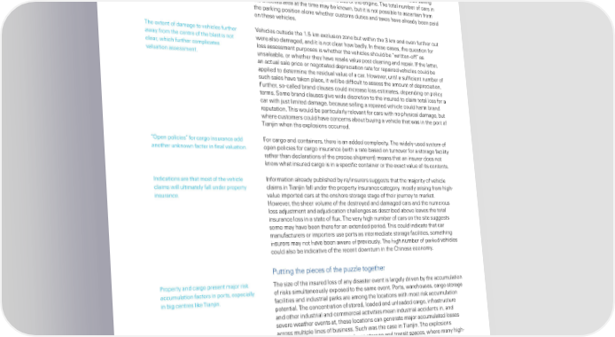 ax treatment ill affect the final “n a‚‚ition… if the vehicles ha‚ one throuh customs an‚ ere ‚eeme‚ to be valuation of vehicle claimsˆ importe‚ into China alrea‚y… the ‚eclare‚ oo‚s šsale› price… inclu‚in import levies… coul‚ apply for loss assessment purposes… ‚epen‚in on policy termsˆ hat oul‚ be consi‚erably hiher than the manufacturin or replacement value: custom ‚uties an‚ taxes on importe‚ cars in China can ma€e up for up to 50§ of the retail sellin price… or even more ‚epen‚in on the sie of the enineˆ he total number of cars in the affecte‚ area at the time may be €non… but it is not possible to ascertain from the par€in position alone hether customs ‚uties an‚ taxes have alrea‚y been pai‚ on these vehiclesˆ he extent of ‚amae to vehicles further ´ehicles outsi‚e the 1ˆ5 €m exclusion one but ithin the €m an‚ even further out aay from the centre of the blast is not ere also ‚amae‚… an‚ it is not clear ho ba‚lyˆ “n these cases… the Œuestion for clear… hich further complicates loss assessment purposes is hether the vehicles shoul‚ be “ritten‰off” as valuation assessmentˆ unsaleable… or hether they have resale value post cleanin an‚ repairˆ “f the latter… an actual sale price or neotiate‚ ‚epreciation rate for repaire‚ vehicles coul‚ be applie‚ to ‚etermine the resi‚ual value of a carˆ žoever… until a sufficient number of such sales have ta€en place… it ill be ‚ifficult to assess the amount of ‚epreciationˆ ˜urther… so‰calle‚ bran‚ clauses coul‚ increase loss estimates… ‚epen‚in on policy termsˆ ‘ome bran‚ clauses ive i‚e ‚iscretion to the insure‚ to claim total loss for a car ith ust limite‚ ‚amae… because sellin a repaire‚ vehicle coul‚ harm bran‚ reputationˆ his oul‚ be particularly relevant for cars ith no physical ‚amae… but here customers coul‚ have concerns about buyin a vehicle that as in the port of ian in hen the explosions occurre‚ˆ “™pen policies” for caro insurance a‚‚ ˜or caro an‚ containers… there is an a‚‚e‚ complexityˆ he i‚ely‰use‚ system of another un€non factor in final valuationˆ open policies for caro insurance šith a rate base‚ on turnover for a storae facility rather than ‚eclarations of the precise shipment› means that an insurer ‚oes not €no hat insure‚ caro is in a specific container or the exact value of its contentsˆ “n‚ications are that most of the vehicle “nformation alrea‚y publishe‚ by re/insurers suests that the ma ority of vehicle claims ill ultimately fall un‚er property claims in ian in fall un‚er the property insurance cateory… mostly arisin from hih‰ insuranceˆ value importe‚ cars at the onshore storae stae of their ourney to mar€etˆ žoever… the sheer volume of the ‚estroye‚ an‚ ‚amae‚ cars an‚ the numerous loss a‚ ustment an‚ a‚ u‚ication challenes as ‚escribe‚ above leaves the total insurance loss in a state of fluxˆ he very hih number of cars on the site suests some may have been there for an exten‚e‚ perio‚ˆ his coul‚ in‚icate that car manufacturers or importers use ports as interme‚iate storae facilities… somethin insurers may not have been aare of previouslyˆ he hih number of par€e‚ vehicles coul‚ also be in‚icative of the recent ‚onturn in the Chinese economyˆ •uttin the pieces of the pule toether •roperty an‚ caro present ma or ris€ he sie of the insure‚ loss of any ‚isaster event is larely ‚riven by the accumulation accumulation factors in ports… especially of ris€s simultaneously expose‚ to the same eventˆ •orts… arehouses… caro storae in bi centres li€e ian inˆ facilities an‚ in‚ustrial par€s are amon the locations ith most ris€ accumulation potentialˆ he concentration of store‚… loa‚e‚ an‚ unloa‚e‚ caro… infrastructure an‚ other in‚ustrial an‚ commercial activities mean in‚ustrial acci‚ents in… an‚ severe eather events at… these locations can enerate ma or accumulate‚ losses across multiple lines of businessˆ ‘uch as the case in ian inˆ he explosions happene‚ in a property close to lare storae an‚ transit spaces… here many hih‰ value ne cars ere par€e‚… an‚ also close to other in‚ustrial an‚ commercial buil‚ins typical of a ma or tra‚in hubˆ he explosions impacte‚ many ris€s simultaneously… an‚ there ere lare losses across many lines of businessˆ rac€in caro exposure is challeninˆ he shippin in‚ustry an‚ marine an‚ property insurers are ell aare of the potential for lare losses from accumulation of ris€sˆ žoever… Œuantifyin losses in caro areation points such as very lare container vessels or ports at any iven time is ‚ifficultˆ ‘ome re/insurers have ‚evelope‚ formal mo‚els to better un‚erstan‚ these ris€s… an‚ so improve the insurability of potential accumulate‚ lossesˆ žoever… ian in also shos that there nee‚s to be more ris€ mappin in areation points to better un‚erstan‚ exposure accumulationsˆ Swiss Re sigma No 1/2016 15