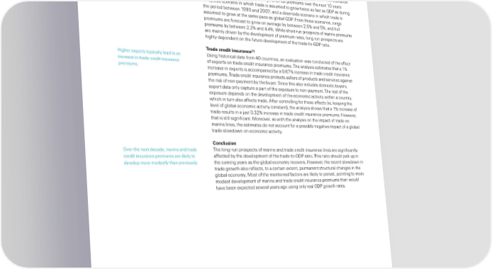 led to a decrease in ships’ market value. This and a trend towards larger ships, carring more cargo or less cost, might also eplain the lower longrun response o hull premiums to trade relative to cargo premiums. ™ongrun premium growth orecasts are sing an eternal orecast or gloal real € growth, Tale 1 presents two scenarios highl dependent on the uture path o or average real growth rates o cargo and hull premiums over the net 10 ears‚ tradeto € ratio. an upside scenario in which trade is assumed to grow twice as ast as € as during the period etween 1ƒƒ0 and 200„… and a downside scenario in which trade is assumed to grow at the same pace as gloal €. †rom these scenarios, cargo premiums are orecast to grow on average etween 2.‡ˆ and ‡ˆ, and hull premiums etween 2.2ˆ and ‰.‰ˆ. Šhile shortrun prospects o marine premiums are mainl driven the development o premium rates, long run prospects are highl dependent on the uture development o the tradeto € ratio. Trade credit insurance23 “igher eports tpicall lead to an sing historical data rom ‰0 countries, an evaluation was conducted o the eect increase in trade credit insurance o eports on trade credit insurance premiums. The analsis estimates that a 1ˆ premiums. increase in eports is accompanied a 0.6„ˆ increase in trade credit insurance premiums. Trade credit insurance protects sellers o products and services against the risk o nonpament the uer. ‹ince this also includes domestic uers, eport data onl capture a part o the eposure to nonpament. The rest o the eposure depends on the development o the economic activit within a countr, which in turn also aects trade. Œter controlling or these eects Žie, keeping the level o gloal economic activit constant‘, the analsis shows that a 1ˆ increase o trade results in a ’ust 0.32ˆ increase in trade credit insurance premiums. “owever, that is still signiicant. ”oreover, as with the analsis on the impact o trade on marine lines, the estimates do not account or a possile negative impact o a gloal trade slowdown on economic activit. Conclusion —ver the net decade, marine and trade The longrun prospects o marine and trade credit insurance lines are signiicantl credit insurance premiums are likel to aected the development o the tradeto € ratio. This ratio should pick up in develop more modestl than previousl. the coming ears as the gloal econom recovers. “owever, the recent slowdown in trade growth also relects, to a certain etent, permanent structural changes in the gloal econom. ”ost o the mentioned actors are likel to persist, pointing to more modest development o marine and trade credit insurance premiums than would have een epected several ears ago using onl real € growth rates. 23 †or an economic analsis o the trade credit insurance market, see Trade credit insurance & surety: taking stock after the financial crisis, —ctoer 201‰, ‹wiss ˜e. Swiss Re sigma No 3/2016 21
