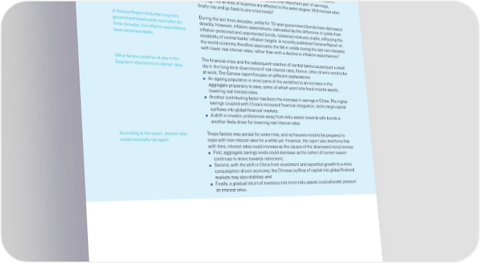 Low interest rates fore er… nterest rates remain very low ater the ter the inancial crisis‰ maŠor central bans ept policy rates at close to §ero or inancial crisis… about seven years to support economic recovery and put upward pressure on prices… n this context‰ the conse«uences o the interest rate hie by the ‹„ ¥ed in ecember 201 and the direction o longŽterm interest rates raise ey «uestions or insurers… This is because income rom inancial assets is an important part o earnings‰ although not all lines o business are aected to the same degree… Œill interest rates inally rise and go bac to preŽcrisis levels¬ eneva ˜eport inds that longŽterm uring the last three decades‰ yields or 10Žyear government bonds have decreased government bond yields have allen or steadily… ‘owever‰ inlation expectations‰ calculated by the dierence in yields rom three decades‰ but inlation expectations inlationŽprotected and unprotected bonds‰ remained relatively stable‰ relecting the have remained stable… credibility o central bans’ inlation targets… recently published eneva ˜eport on the world economy thereore associates the all in yields during the last two decades with lower real interest rates‰ rather than with a decline in inlation expectations… ¢ther actors could be at play in the The inancial crisis and the subse«uent reaction o central bans caused Šust a small longŽterm downtrend in interest rates… dip in the longŽterm down trend o real interest rates… ‘ence‰ other drivers need to be at wor… The eneva report ocuses on dierent explanations“ ̤ n ageing population in most parts o the world led to an increase in the aggregate propensity to save‰ some o which went into ixed income assets‰ lowering real interest rates… ̤ nother contributing actor has been the increase in savings in —hina… The higher savings coupled with —hina’s increased inancial integration‰ led to large capital outlows into global inancial marets… ̤ shit in investor preerences away rom risy assets towards sae bonds is another liely driver or lowering real interest rates… ccording to the report‰ interest rates These actors may persist or some time‰ and re/insurers need to be prepared to could eventually rise again… cope with low interest rates or a while yet… ‘owever‰ the report also mentions that with time‰ interest rates could increase as the causes o the downward trend reverse“ ̤ ¥irst‰ aggregate savings levels could decrease as the cohort o current savers continues to move towards retirementŸ ̤ „econd‰ with the shit in —hina rom investment and exportled growth to a more consumptionŽdriven economy‰ the —hinese outlow o capital into global inancial marets may also stabiliseŸ and ̤ ¥inally‰ a gradual return o investors into more risy assets could alleviate pressure on interest rates… 5 Low for Long? Causes and Consequences of Persistently Low Interest Rates, ¢ctober 201‰ nternational —enter or ‚onetary and ¦aning „tudies †—‚¦‡ and —entre or Economic €olicy ˜esearch †—E€˜‡… Swiss Re sigma No 3/2016 ƒ