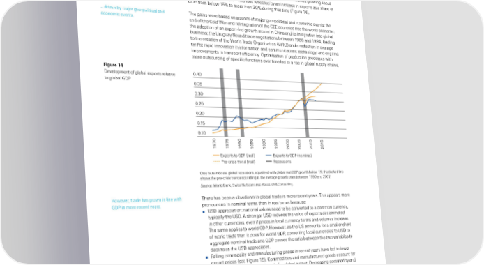 lobal trade and insurance maret growth ntroduction Trade volumes grew about twice as ast Trade data o the last 10 years tell a straightorward story“ excluding periods o as global output in the two decades prior recession‰ and during and between Œorld Œars and ‰ growth in global trade volumes mostly exceeded growth in global real €…¡ to 200ƒ … The outperormance was most pronounced rom the late 1¡0s to midŽ2000s‰ with trade volumes growing about 10 twice as ast as real €… This was relected by an increase in exports as a share o € rom below 1ˆ to more than 30ˆ during that time †¥igure 1’‡… … driven by maŠor geoŽpolitical and The gains were based on a series o maŠor geoŽpolitical and economic events“ the economic events… end o the —old Œar and reintegration o the —EE countries into the world economyŸ the adoption o an exportŽled growth model in —hina and its integration into global businessŸ the ‹ruguay ˜ound trade negotiations between 1¡6 and 1¡¡’‰ leading to the creation o the Œorld Trade ¢rganisation †ŒT¢‡ and a reduction in average tarisŸ rapid innovation in inormation and communications technologyŸ and ongoing improvements in transport eiciency… ¢ptimisation o production processes with more outsourcing o speciic unctions over time led to a rise in global supply chains… Figure 14 evelopment o global exports relative 0.40 to global € 0.35 Exports to GDP (nominal) 0.30 Exports to GDP (real) 0.25 0.20 0.15 0.10 70 75 80 85 90 95 000 05 10 15 19 19 19 19 19 19 2 20 20 20 Exports to GDP (real)Exports to GDP (nominal) Pre-crisis tren (real) ecessions rey bars indicate global recessions‰ e«uali§ed with global real € growth below 1ˆŸ the dashed line shows the preŽcrisis trends according to the average growth rates between 1¡¡0 and 200ƒ… „ource“ Œorld ¦an‰ „wiss ˜e Economic ˜esearch ™ —onsulting… ‘owever‰ trade has grown in line with There has been a slowdown in global trade in more recent years… This appears more € in more recent years… pronounced in nominal terms than in real terms because“ ̤ ‹„ appreciation“ national values need to be converted to a common currency‰ typically the ‹„… stronger ‹„ reduces the value o exports denominated in other currencies‰ even i prices in local currency terms and volumes increase… The same applies to world €… ‘owever‰ as the ‹„ accounts or a smaller share o world trade than it does or world €‰ converting local currencies to ‹„ to aggregate nominal trade and € causes the ratio between the two variables to decline as the ‹„ appreciates… ̤ ¥alling commodity and manuacturing prices in recent years have led to lower export prices †see ¥igure 1‡… —ommodities and manuactured goods account or a larger share o trade than they do or global output… ecreasing commodity and manuacturing prices thereore have a larger negative eect on nominal exports than on nominal €‰ causing the ratio between the two variables to decline… 9 … rwin‰ “”ongŽrun trends in world trade and income”‰ World Trade Review, 1†1‡ 2002‰ pp… ¡–100… 10 —… —onstantinescu‰ … ‚attoo and ‚… ˜uta‰ “The lobal Trade „lowdownŸ —yclical or „tructural¬”‰ IMF Woring Paers, 1†6‡‰ 201… 16 Swiss Re sigma No 3/2016
