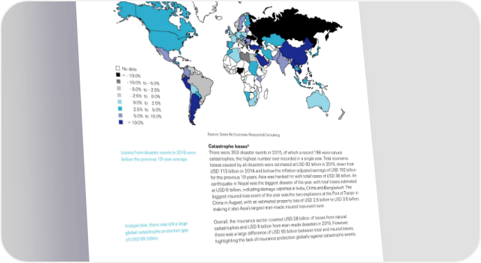 Figure 11 NonŽlie real premium growth‰ 201 No data < –10.0% –10.0% to –5.0% –5.0% to –2.5% –2.5% to 0.0% 0.0% to 2.5% 2.5% to 5.0% 5.0% to 10.0% > 10.0% „ource“ „wiss ˜e Economic ˜esearch ™ —onsulting… Œatastro‡‚e losses ”osses rom disaster events in 201 were There were 33 disaster events in 201‰ o which a record 1¡ were natural below the previous 10Žyear average… catastrophes‰ the highest number ever recorded in a single year… Total economic losses caused by all disasters were estimated at ‹„ ¡2 billion in 201‰ down rom ‹„ 113 billion in 201’ and below the inlationŽadŠusted average o ‹„ 1¡2 billion or the previous 10 years… sia was hardest hit with total losses o ‹„ 3 billion… n earth«uae in Nepal was the biggest disaster o the year‰ with total losses estimated at ‹„ 6 billion‰ including damage reported in ndia‰ —hina and ¦angladesh… The biggest insuredŽloss event o the year was the two explosions at the €ort o TianŠin in —hina in ugust‰ with an estimated property loss o ‹„ 2… billion to ‹„ 3… billion‰ maing it also sia’s largest manŽmade insured loss event ever… rrespective‰ there was still a large ¢verall‰ the insurance sector covered ‹„ 2 billion o losses rom natural global catastrophe protection gap catastrophes and ‹„ ¡ billion rom manŽmade disasters in 201… ‘owever‰ o ‹„ billion… there was a large dierence o ‹„ billion between total and insured losses‰ highlighting the lac o insurance protection globally against catastrophe events… 8 sigma 1/2016 – Natural catastrophes and manŽmade disasters in 201“ sia suers substantial losses‰ „wiss ˜e… Swiss Re sigma No 3/2016 13
