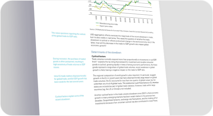 Figure 15 140 lobal manuacturing and export price 130 Export price index indices †200¯100‡ 120 Manufacturing price index 110 100 90 80 70 2 4 6 8 2 4 6 8 10 12 14 16 9 9 9 9 000 0 0 0 0 0 0 0 0 19 19 19 19 2 20 20 20 20 2 2 2 2 Manufacturing price index Export price index „ource“ —€¦ Netherlands ¦ureau or Economic €olicy nalysis‰ „wiss ˜e Economic ˜esearch ™ —onsulting… This raises «uestions regarding the outloo ‹„ aggregation eects overstate the magnitude o the recent slowdown in trade‰ o the global tradeŽtoŽ€ ratio… but it is also visible in real terms… This raises the «uestion o whether the trade slowdown is cyclical or relects a structural change in the world economy… nd‰ i the latter‰ how will the decrease in the tradeŽtoŽ€ growth ratio impact global economic growth¬ eterminants o the slowdown Œ€clical factors uring recession‰ the purchase o traded Trade volumes normally respond more than proportionally to movements in real €… 11 goods is oten postponed‰ resulting in rwin explains this by citing that demand or investment and durable consumer high sensitivity o trade volumes to € goods is cyclical‰ growing rapidly in times o strong economic perormance… s these moves… goods represent a large share o global trade volumes‰ recent weaness in global growth is liely having a negative impact on the tradeŽtoŽ€ ratio… ntraŽE‹ trade matters disproportionally The regional composition o world growth is also important… n particular‰ sluggish or global trade‰ and E‹ € growth has growth in the E‹ in recent years has had a disproportionally large impact on global been wea or the last several years… trade volumes“ the E‹ accounts or less than one «uarter o global output‰ but or more than one third o global trade… The substantial trade lows between E‹ member states are included as part o global trade statistics… ‘owever‰ trade within large countries †eg‰ the ‹„ or —hina‡ is not included… —yclical actors explain some o the nother cyclical actor in the tradeŽvolume slowdown since 200ƒ is that economic recent slowdown… growth in many emerging marets has been wea relative to the previous two decades… eopolitical tensions‰ exchange rate luctuations‰ and the holding o o investments because o an uncertain outloo has also contributed to lower lows… 11 rwin‰ op… cit… Swiss Re sigma No 3/2016 1ƒ