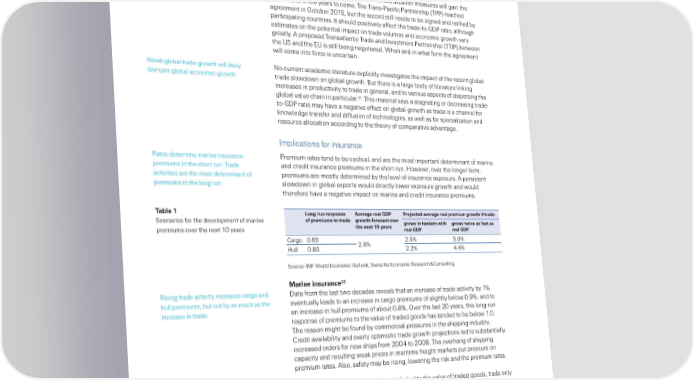 Žloƒal trade and insurance ar„et growt‚ rates… —hanges in underlying actors causing the recent decline o the tradeŽtoŽ€ ratio are liely to persist“ —hina’s transition to a more consumption and serviceŽdriven growth model will proceed‰ and gains rom urther international dispersion o production networs may have peaed… T€€ and TT€ might be a source or a t is unclear whether protectionism or trade liberali§ation measures will gain the renewed boost to the tradeŽtoŽ€ ratio… upper hand in the years to come… The TransŽ€aciic €artnership †T€€‡ reached agreement in ¢ctober 201‰ but the accord still needs to be signed and ratiied by participating countries… t should positively aect the tradeŽtoŽ€ ratio‰ although estimates on the potential impact on trade volumes and economic growth vary greatly… proposed Transatlantic Trade and nvestment €artnership †TT€‡ between the ‹„ and the E‹ is still being negotiated… Œhen and in what orm the agreement will come into orce is uncertain… Œea global trade growth will liely No current academic literature explicitly investigates the impact o the recent global dampen global economic growth… trade slowdown on global growth… ¦ut there is a large body o literature lining increases in productivity to trade in general‰ and to various aspects o dispersing the global value chain in particular…21 This material says a stagnating or decreasing tradeŽ toŽ€ ratio may have a negative eect on global growth as trade is a channel or nowledge transer and diusion o technologies‰ as well as or speciali§ation and resource allocation according to the theory o comparative advantage… mplications or insurance ˜ates determine marine insurance €remium rates tend to be cyclical‰ and are the most important determinant o marine premiums in the short run… Trade and credit insurance premiums in the short run… ‘owever‰ over the longer term‰ activities are the main determinant o premiums are mostly determined by the level o insurance exposure… persistent premiums in the long run… slowdown in global exports would directly lower exposure growth and would thereore have a negative impact on marine and credit insurance premiums… Taƒle 1 Long-run res‡onse ’ erage real Ž“† †ro”ected a erage real ‡reiu growt‚ if trade: „cenarios or the development o marine of ‡reius to trade growt‚ forecast o er grows in tande wit‚ grows twice as fast as premiums over the next 10 years t‚e net 10 €ears real Ž“† real Ž“† —argo 0…¡ 2…ˆ 2…ˆ …0ˆ ‘ull 0…0 2…2ˆ ’…’ˆ „ource“ ‚¥ Œorld Economic ¢utloo‰ „wiss ˜e Economic ˜esearch ™ —onsulting… 22 ‘arine insurance ˜ising trade activity increases cargo and ata rom the last two decades reveals that an increase o trade activity by 1ˆ hull premiums‰ but not by as much as the eventually leads to an increase in cargo premiums o slightly below 0…¡ˆ‰ and to increase in trade… an increase in hull premiums o about 0…ˆ… ¢ver the last 20 years‰ this longŽrun response o premiums to the value o traded goods has tended to be below 1…0… The reason might be ound by commercial pressures in the shipping industry… —redit availability and overly optimistic trade growth proŠections led to substantially increased orders or new ships rom 200’ to 200… The overhang o shipping capacity and resulting wea prices in maritime reight marets put pressure on premium rates… lso‰ saety may be rising‰ lowering the ris and the premium rates… trend towards larger ships has ept Œhile cargo premiums can be directly lined to the value o traded goods‰ trade only average hull premium below cargo indirectly aects hull premiums through the assumption that the global value o ships premium growth rates… is connected to the total value o its cargo… The excess supply o shipping capacity 21 „ee ‚… miti and •… –onings‰ “Trade ”iberali§ation‰ ntermediate nputs‰ and €roductivity“ Evidence rom ndonesia”‰ merican ‚conomic Review‰ vol ¡ƒ‰ no 200ƒ‰ pp 1611–163… lso €… –… oldberg‰ … –… –handelwal‰ N… €avcni et al…‰ “mported ntermediate nputs and omestic €roduct rowth“ Evidence rom ndia”‰ …uarterly †ournal of ‚conomics‰ vol 12‰ no ’ 2010‰ pp 1ƒ2ƒ–1ƒ6ƒ‰ and … ‚… rossman and E… ˜ossiŽ‘ansberg‰ “Trading Tass“ „imple Theory o ¢shoring…” merican ‚conomic Review‰ vol ¡‰ no 200‰ pp 1¡ƒ–¡ƒ… 22 The econometric analyses in this chapter ollows the methodology used in sigma ’/2013“ Navigating recent developments in marine and airline insurance‰ „wiss ˜e… 20 Swiss Re sigma No 3/2016