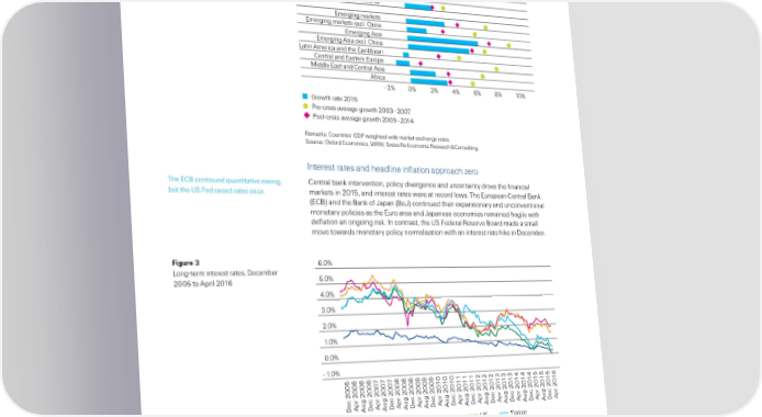 T‚e gloƒal econo€ and financial ar„ets in 2015 Figure 2 rld ˜eal € growth by region in 201‰ and preŽ and postŽinancial crisis average Adanced markets rth America estern Ere Adanced Asia ceania Emerging markets Emerging markets excl. China Emerging Asia Emerging Asia excl. China Latin America and the Caribbean Central and Eastern Ere Middle East and Central Asia Aˆrica –2% 0% 2% 4% 6% 8% 10% †r‚th rate 201‡ re€crisis aerage gr‚th 200„–200… st€crisis aerage gr‚th 200ƒ–2014 ˜emars“ —ountries’ € weighted with maret exchange rates… „ource“ ¢xord Economics‰ ŒŒ‰ „wiss ˜e Economic ˜esearch ™ —onsulting… nterest rates and headline inlation approach §ero The E—¦ continued «uantitative easing‰ —entral ban intervention‰ policy divergence and uncertainty drove the inancial but the ‹„ ¥ed raised rates once… marets in 201‰ and interest rates were at record lows… The European —entral ¦an †E—¦‡ and the ¦an o •apan †¦o•‡ continued their expansionary and unconventional monetary policies as the Euro area and •apanese economies remained ragile with delation an ongoing ris… n contrast‰ the ‹„ ¥ederal ˜eserve ¦oard made a small move towards monetary policy normalisation with an interest rate hie in ecember… Figure 6.0% ”ongŽterm interest rates‰ ecember 200 to pril 2016 5.0% 4.0% 3.0% 2.0% 1.0% 0.0% –1.0% Dec 2005Apr 2006Aug 2006Dec 2006Apr 2007Aug 2007Dec 2007Apr 2008Aug 2008Dec 2008Apr 2009Aug 2009Dec 2009Apr 2010Aug 2010Dec 2010Apr 2011Aug 2011Dec 2011Apr 2012Aug 2012Dec 2012Apr 2013Aug 2013Dec 2013Apr 2014Aug 2014Dec 2014Apr 2015Aug 2015Dec 2015Apr 2016 US Japan Germany U France „ource“ atastream… ’ Swiss Re sigma No 3/2016