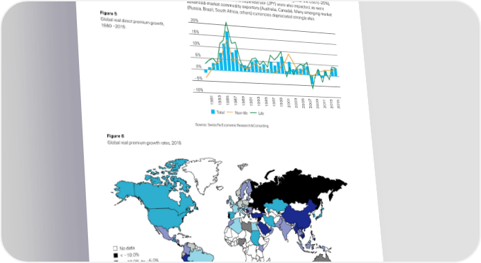 nsurance premium growth steady lobal insurance premiums continued to grow in 201 lobal premiums grew by a real 3…ˆ Total direct premiums written grew by 3…ˆ in real terms in 201‰ up rom 3…ˆ 6 in 201‰ but declined by ’…2ˆ to growth in 201’… lobal premium volumes were ‹„ ’ ’ billion‰ which in nominal ‹„ ’ ’ billion in nominal terms… terms was ’…2ˆ less than the previous year‰ due to signiicant currency depreciation against the ‹„ dollar †‹„‡… The euro lost signiicant value against the ‹„ †–20ˆ‡‰ and ‹– sterling †¦€‡ and the •apanese yen †•€µ‡ were also impacted‰ as were advancedŽmaret commodity exporters † ustralia‰ —anada‡… ‚any emerging maret †˜ussia‰ ¦ra§il‰ „outh rica‰ others‡ currencies depreciated strongly also… Figure 5 20% lobal real direct premium growth‰ 1¡0 –201 15% 10% 5% 0% –5% –10% 1 3 5 7 9 1 3 5 7 3 5 9 11 13 15 8 8 8 8 8 9 9 9 9 999 01 0 0 07 0 0 0 0 19 19 19 19 19 19 19 19 19 1 0 0 2 2 2 2 20 20 2 20 Total Non-life Life „ource“ „wiss ˜e Economic ˜esearch ™ —onsulting… Figure lobal real premium growth rates‰ 201 No data < –10.0% –10.0% to –5.0% –5.0% to –2.5% –2.5% to 0.0% 0.0% to 2.5% 2.5% to 5.0% 5.0% to 10.0% > 10.0% „ource“ „wiss ˜e Economic ˜esearch ™ —onsulting… 6 ‹nless otherwise stated‰ all premium growth rates indicate changes in real terms †ie‰ adŠusted or local consumer price inlation‡… Swiss Re sigma No 3/2016