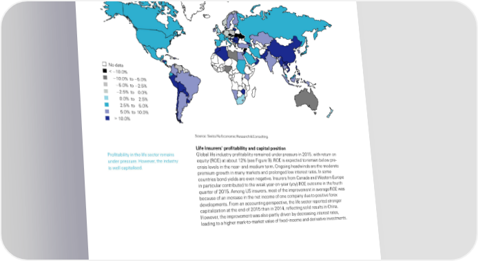 Insurance premium growth steady Figure 8 •ie real remium growth 201 No data < –10.0% –10.0% to –5.0% –5.0% to –2.5% –2.5% to 0.0% 0.0% to 2.5% 2.5% to 5.0% 5.0% to 10.0% > 10.0% Source: Swiss Re Economic Research & Consulting. Life insurers’ profitability and capital position –roitailit in the lie sector remains Gloal lie inustr roitailit remaine uner ressure in 201 with return on uner ressure. ”owe‰er the inustr euit €R‚Eƒ at aout 12„ €see …igure †ƒ. R‚E is e‡ecte to remain elow reˆ is well caitalise. crisis le‰els in the nearˆ an meium term. ‚ngoing heawins are the moerate remium growth in man marŠets an rolonge low interest rates. ‹n some countries on iels are e‰en negati‰e. ‹nsurers rom Canaa an Œestern Euroe in articular contriute to the weaŠ earˆonˆear €oƒ R‚E outcome in the ourth uarter o 201. Žmong ‘S insurers most o the imro‰ement in a‰erage R‚E was ecause o an increase in the net income o one coman ue to ositi‰e ore‡ e‰eloments. …rom an accounting ersecti‰e the lie sector reorte stronger caitali’ation at the en o 201 than in 201“ relecting soli results in China. ”owe‰er the imro‰ement was also artl ri‰en ecreasing interest rates leaing to a higher marŠˆtoˆmarŠet ‰alue o i‡eˆincome an eri‰ati‰e in‰estments. 10 Swiss Re sigma No 3/2016