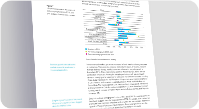 ”ie insurance“ positive overall growth mass regional disparities †reiu de elo‡ent lobal lie insurance premiums rose by lobal direct lie premiums written totalled ‹„ 2 3’ billion in 201‰ down ’…6ˆ ’…0ˆ in 201‰ slightly slower than in the in nominal terms but up ’…0ˆ in real terms ater a ’…3ˆŽreal gain in 201’… n the last previous year… two years‰ global lie premium growth has exceeded both the preŽ and postŽcrisis averages †see ¥igure ƒ‡… ‘owever‰ the overall growth mass considerable variation across regions and countries… ”ast year premium growth in the advanced marets slowed‰ but accelerated in the emerging marets… Figure ˆ World ”ie premium growth in the advanced and emerging marets in 201‰ and Advanced markets preŽ and postŽinancial crisis averages North America Western Europe Advanced Asia Oceania Emerging markets Emerging markets excl. China Emerging Asia Emerging Asia excl. China Latin America and the Caribbean Central and Eastern Europe Middle East and Central Asia A…rica † „† † „† † „† † ƒroth rate „ Precrisis average groth €‚ Postcrisis average groth „ource“ „wiss ˜e Economic ˜esearch ™ —onsulting… €remium growth in the advanced n the advanced marets‰ premiums recovered in North merica ollowing two years marets slowedŸ it accelerated in o contraction… There was also renewed momentum in •apan… n ¢ceania‰ however‰ the emerging marets… marets declined sharply‰ mainly due to base eects ater very solid growth in ustralia in 201’… There was minimal growth in Œestern Europe‰ mainly due to a contraction in ermany… mong the emerging marets‰ growth was particularly strong in emerging sia‰ supported by solid gains in a number o countries including —hina‰ ndia‰ ndonesia and the €hilippines… ”ie premium growth also strengthened in ”atin merica and remained on a positive trac in rica‰ the ‚iddle East and —entral sia… The improvement in ”atin merica relects robust growth in ¦ra§il and a strong rebound in —hile… ¦y contrast‰ premiums in —EE were down or a third year running‰ mainly because o the two largest marets‰ €oland and the —§ech ˜epublic †see page 32‡… espite signs o recovery o late‰ overall espite the aboveŽaverage growth rates in 201’ and 201‰ lie insurance premiums lie premium growth has been sluggish have been sluggish since the inancial crisis in 200… ¢n average‰ advancedŽmaret since the inancial crisis… premiums have stagnated since then‰ with very little and even negative lie premium growth in Œestern Europe and North merica… The emerging marets have also slowed maredly‰ with premium growth less than hal preŽcrisis levels… Swiss Re sigma No 3/2016 ¡