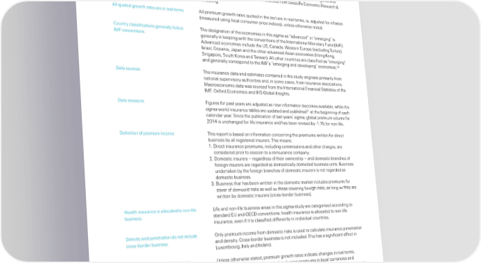 ‚ethodology and data This study loos at insurance premium This sigma study is based on the direct premium volumes o insurance companies‰ volumes data rom 1’ƒ countries… regardless o whether private or stateŽowned… €remiums paid to state social insurers are not included… ”ie and nonŽlie premium volume in 1’ƒ countries is examined… etailed inormation on the largest countries in terms o total insurance premium volume can be ound in the statistical appendix… Œhere not indicated‰ igures and chart inormation in this report are all sourced rom „wiss ˜e Economic ˜esearch ™ —onsulting… ll «uoted growth rates are in real terms ll premium growth rates «uoted in the text are in real terms‰ ie‰ adŠusted or inlation †measured using local consumer price indices‡‰ unless otherwise noted… —ountry classiications generally ollow The designation o the economies in this sigma as “advanced” or “emerging” is ‚¥ conventions… generally in eeping with the conventions o the nternational ‚onetary ¥und †‚¥‡… dvanced economies include the ‹„‰ —anada‰ Œestern Europe †excluding Turey‡‰ srael‰ ¢ceania‰ •apan and the other advanced sian economies †‘ong –ong‰ „ingapore‰ „outh –orea and Taiwan‡… ll other countries are classiied as “emerging” and generally correspond to the ‚¥’s “emerging and developing” economies…30 ata sources… The insurance data and estimates contained in the study originate primarily rom national supervisory authorities and‰ in some cases‰ rom insurance associations… ‚acroeconomic data was sourced rom the nternational ¥inancial „tatistics o the ‚¥‰ ¢xord Economics and ‘„ lobal nsights… ata revisions ¥igures or past years are adŠusted as new inormation becomes available‰ while the 31 sigma world insurance tables are updated and published at the beginning o each calendar year… „ince the publication o last years’ sigma‰ global premium volume or 201’ is unchanged or lie insurance and has been revised by Ž1…1ˆ or nonŽlie… einition o premium income This report is based on inormation concerning the premiums written or direct business by all registered insurers… This means“ 1… irect insurance premiums‰ including commissions and other charges‰ are considered prior to cession to a reinsurance company… 2… omestic insurers – regardless o their ownership – and domestic branches o oreign insurers are regarded as domestically domiciled business units… ¦usiness undertaen by the oreign branches o domestic insurers is not regarded as domestic business… 3… ¦usiness that has been written in the domestic maret includes premiums or cover o domestic riss as well as those covering oreign riss‰ as long as they are written by domestic insurers †crossŽborder business‡… ‘ealth insurance is allocated to nonŽlie ”ie and nonŽlie business areas in this sigma study are categorised according to business… standard E‹ and ¢E— conventions“ health insurance is allocated to nonŽlie insurance‰ even i it is classiied dierently in individual countries… ensity and penetration do not include ¢nly premium income rom domestic riss is used to calculate insurance penetration crossŽborder business… and density… —rossŽborder business is not included… This has a signiicant eect in ”uxembourg‰ taly and reland… rowth rates in local currency are ‹nless otherwise stated‰ premium growth rates indicate changes in real terms… adŠusted or inlation… These real growth rates are calculated using premiums in local currencies and adŠusted or inlation using the consumer price index or each country… The statistical appendix also provides the nominal change in growth or each country… ˜egional aggregated growth rates are calculated using the previous year’s premium volumes and converted into ‹„ dollars at maret exchange rates… The same procedure applies to the economic aggregates o Table ®‰ where the previous year’s nominal € igures in ‹„ dollars are used as weights… 30 The only exceptions are the —§ech ˜epublic‰ Estonia‰ „lovenia and „lovaia… 31 The update o the tables can be ound on www…swissre…com/sigma… Swiss Re sigma No 3/2016 3
