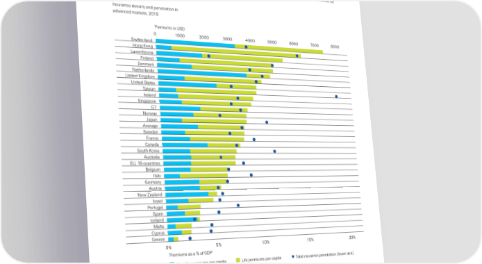 ‰nsurance ‡enetration and densit€ €er capita spending on insurance in n 201‰ average per capita spending on insurance in advanced marets was advanced marets decreased in 201… ‹„ 3’’0‰ down almost 6ˆ rom the previous year due primarily to exchange rate movements… €er capita spending on lie insurance was ‹„ 1¡’ and in nonŽlie it was ‹„ 1’6… €enetration remained at the same level since it is unaected by exchange rate movements… Figure 1‹ nsurance density and penetration in advanced marets‰ 201 Premiums in USD 0 1000 2000 3000 4000 5000 6000 7000 8000 Switzerland Hong Kong Luxembourg Finland Denmark Netherlands United Kingdom United States Taiwan Ireland Singapore G7 Norway Japan Average Sweden France Canada South Korea Australia EU, 15 countries Belgium Italy Germany Austria New Zealand Israel Portugal Spain Iceland Malta Cyprus Greece 0% 5% 10% 15% 20% Premiums as a % of GDP Non-life premiums per capita Life premiums per capita Total insurance penetration (lower axis) „ource“ „wiss ˜e Economic ˜esearch ™ —onsulting… Swiss Re sigma No 3/2016 23