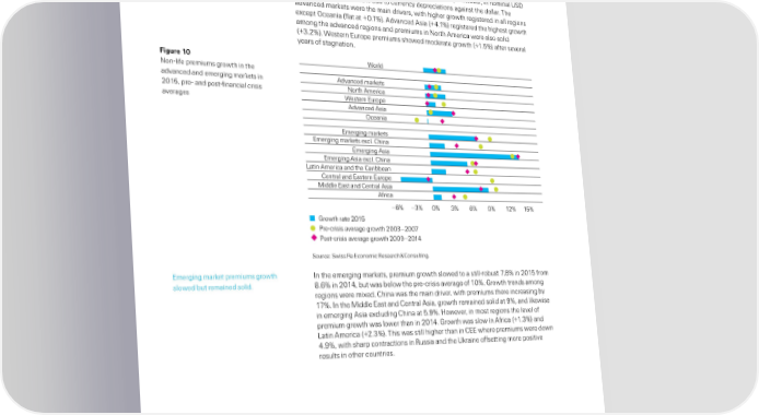 ‰nsurance ‡reiu growt‚ stead€ NonŽlie“ higher premium growth‰ driven by advanced marets Non-life insurance ‡reiu de elo‡ent lobal nonŽlie premium growth lobal nonŽlie insurance sector improved urther in 201‰ with premiums up 3…6ˆ in improved urther in 201‰ mainly real terms to ‹„ 2 020 billion‰ higher than the 2…’ˆŽgain registered in 201’ and driven by advanced marets… also better than preŽcrisis average growth †see ¥igure 10‡… ‘owever‰ in nominal ‹„ terms‰ premiums ell 3…ˆ due to currency depreciations against the dollar… The advanced marets were the main drivers‰ with higher growth registered in all regions except ¢ceania †lat at £0…1ˆ‡… dvanced sia †£’…1ˆ‡ registered the highest growth among the advanced regions and premiums in North merica were also solid †£3…2ˆ‡… Œestern Europe premiums showed moderate growth †£1…ˆ‡ ater several years o stagnation… Figure 10 World NonŽlie premiums growth in the advanced and emerging marets in Advanced markets 201‰ preŽ and postŽinancial crisis North America averages Western Europe Advanced Asia Oceania Emerging markets Emerging markets excl. China Emerging Asia Emerging Asia excl. China Latin America and the Caribbean Central and Eastern Europe Middle East and Central Asia Africa †‡ ‚‡ ‡ ‚‡ †‡ ‡ ‡ …‡ „roth rate … recrisis average groth ‚ ƒ ostcrisis average groth € „ource“ „wiss ˜e Economic ˜esearch ™ —onsulting… Emerging maret premiums growth n the emerging marets‰ premium growth slowed to a stillŽrobust ƒ…ˆ in 201 rom slowed but remained solid… …6ˆ in 201’‰ but was below the preŽcrisis average o 10ˆ… rowth trends among regions were mixed… —hina was the main driver‰ with premiums there increasing by 1ƒˆ… n the ‚iddle East and —entral sia‰ growth remained solid at ¡ˆ‰ and liewise in emerging sia excluding —hina at …¡ˆ… ‘owever‰ in most regions the level o premium growth was lower than in 201’… rowth was slow in rica †£1…3ˆ‡ and ”atin merica †£2…3ˆ‡… This was still higher than in —EE where premiums were down ’…¡ˆ‰ with sharp contractions in ˜ussia and the ‹raine osetting more positive results in other countries… 12 Swiss Re sigma No 3/2016