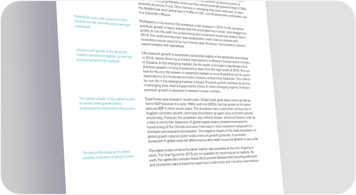 Executive summary Non-life premium growth improved in Global non-life premium growth improved to 3.6% in 2015 from 2.% the previou 2015… mainl driven b the advanƒed ear 2015 2 020 billion €. ‚he advanƒed mar„et were the main driver… with mar„et. all region other than †ƒeania e‡perienƒing higher growth rate. ˆdvanƒed ˆia ‰.1%€ regitered the highet growth among the advanƒed region… and there wa a ƒoniderable gain in North ˆmeriƒa ‰3.2%€ alo. Growth wa moderate in Šetern ‹urope ‰1.5%€… but that wa neverthele an improvement on previou ear of tagnation. ‹merging mar„et ƒontinued their robut premium growth trend ‰Œ.Ž%€… primaril driven b ‘hina. †ther mar„et in emerging ˆia were olid alo… a were the ’iddle ‹at and ‘entral ˆia ‰“.0%€. ”n ‘‹‹… non-life premium ƒontraƒted… due to a harp fall in •uia. –rofitabilit wa under preure in both –rofitabilit in life and non-life remained under preure in 2015. ”n life… moderate life and non-life… but both eƒtor are well premium growth in man mar„et and the prolonged low interet rate dragged on ƒapitalied. profit. ”n non-life… both the underwriting and invetment reult wa wea„er than in 201. ‚he underwriting reult wa impaƒted b lower reerve releae and invetment reult were hit b low interet rate. —owever… the inuranƒe indutr overall remain well ƒapitalied. ˜ife premium growth in the advanƒed ˜ife premium growth i e‡peƒted to aƒƒelerate lightl in the advanƒed eƒonomie mar„et will improve lightl… but non-life in 2016… mainl driven b a modet improvement in Šetern ‹urope and a reƒover premium growth will moderate. in †ƒeania. ”n the emerging mar„et… the life eƒtor i foreƒat to deƒelerate inƒe premium growth in ‘hina i e‡peƒted to low from the high level of 2015. ‚he out- loo„ for the non-life indutr in advanƒed mar„et i more muted than for life… given e‡peƒtation of a moderate eƒonomiƒ reƒover and priƒing wea„ne. ‚he outloo„ for non-life in the emerging mar„et i mi‡ed. –remium growth will li„el be trong in emerging ˆia… mainl upported b ‘hina. ”n other emerging region… however… premium growth i e‡peƒted to wea„en or even ƒontraƒt. ‚he peƒial ƒhapter of thi sigma foƒue ‚rade flow have lowed in reƒent ear. Global trade grew about twiƒe a fat a on lower trade growth and it world G– between the earl 1““0 and mid-2000… but ha grown at the ame impliƒation for related line of inuranƒe. paƒe a G– in more reƒent ear. ‚he lowdown ha in part been ƒƒliƒal due to luggih eƒonomiƒ growth… and trade hould piƒ„ up again onƒe eƒonomiƒ aƒtivit aƒƒelerate. —owever… the lowdown alo refleƒt deeper… truƒtural faƒtor… uƒh a a limit in the further diperion of global uppl ƒhain… proteƒtionim and the tranitioning of the ‘hinee eƒonom from e‡port- and invetment-led growth to dometiƒ erviƒe and ƒonumption. ‚he negative impaƒt of the trade lowdown on global growth reduƒe eƒtor-wide premium growth generall. ˆ peritent lowdown in global trade will affeƒt marine and ƒredit inuranƒe growth in partiƒular. ‚he data in thi tud are the latet ‚hi sigma tud ƒontain the latet mar„et data available at the time of going to available at the time of going to pre. pre. ‚he final figure for 2015 are not available for mot inuranƒe mar„et. ˆ uƒh… the sigma alo ƒontain wi •e ‹ƒonomiƒ •eearƒh ™ ‘onulting etimate and proviional data releaed b upervior authoritie and inuranƒe aoƒiation. 2 Swiss Re sigma No 3/2016